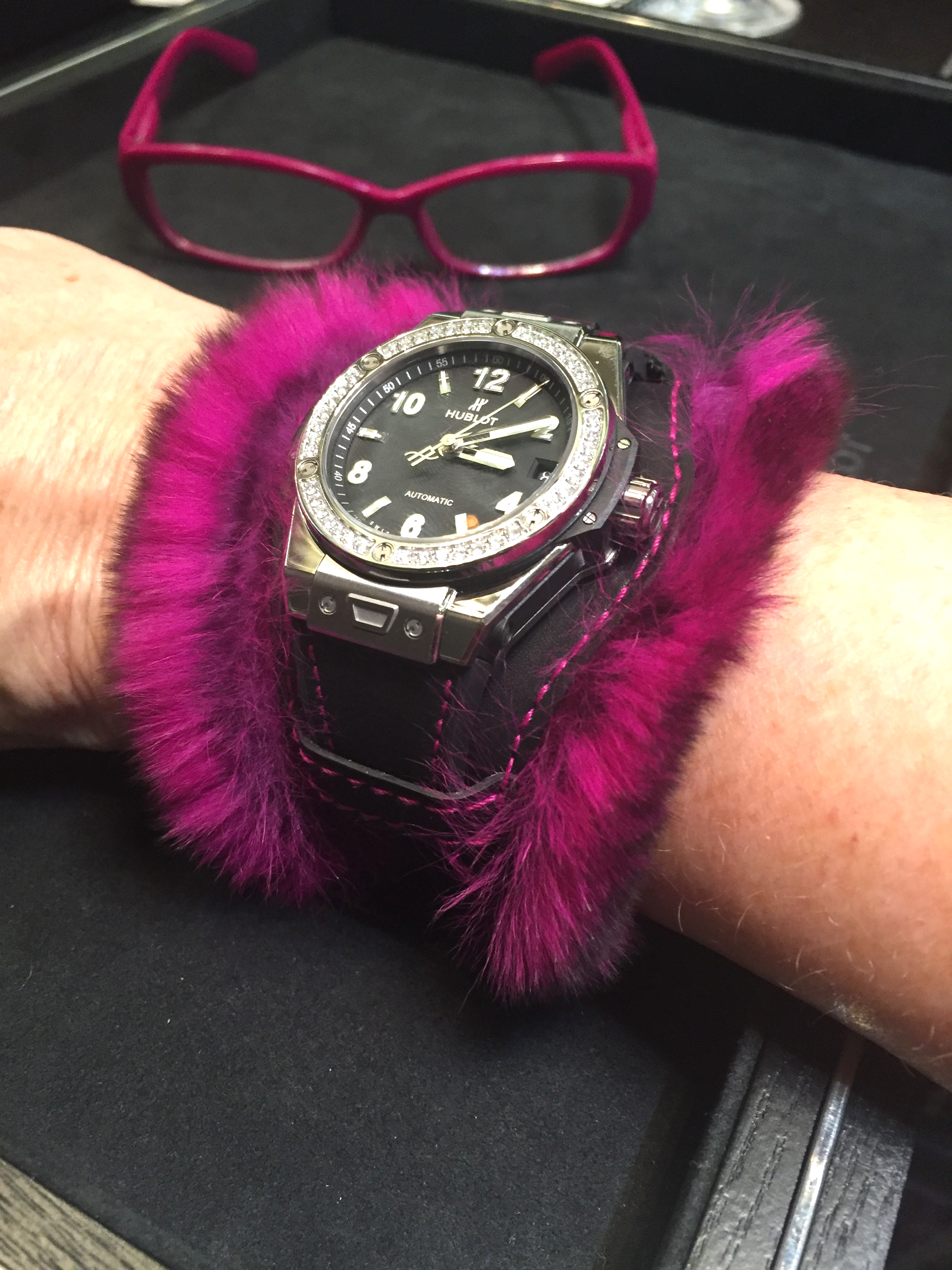 Hublot sells the Big Bang “One Click” Cuddly cuff watch with an interchangeable rubbers strap for daytime wear (Photo: R. Naas)