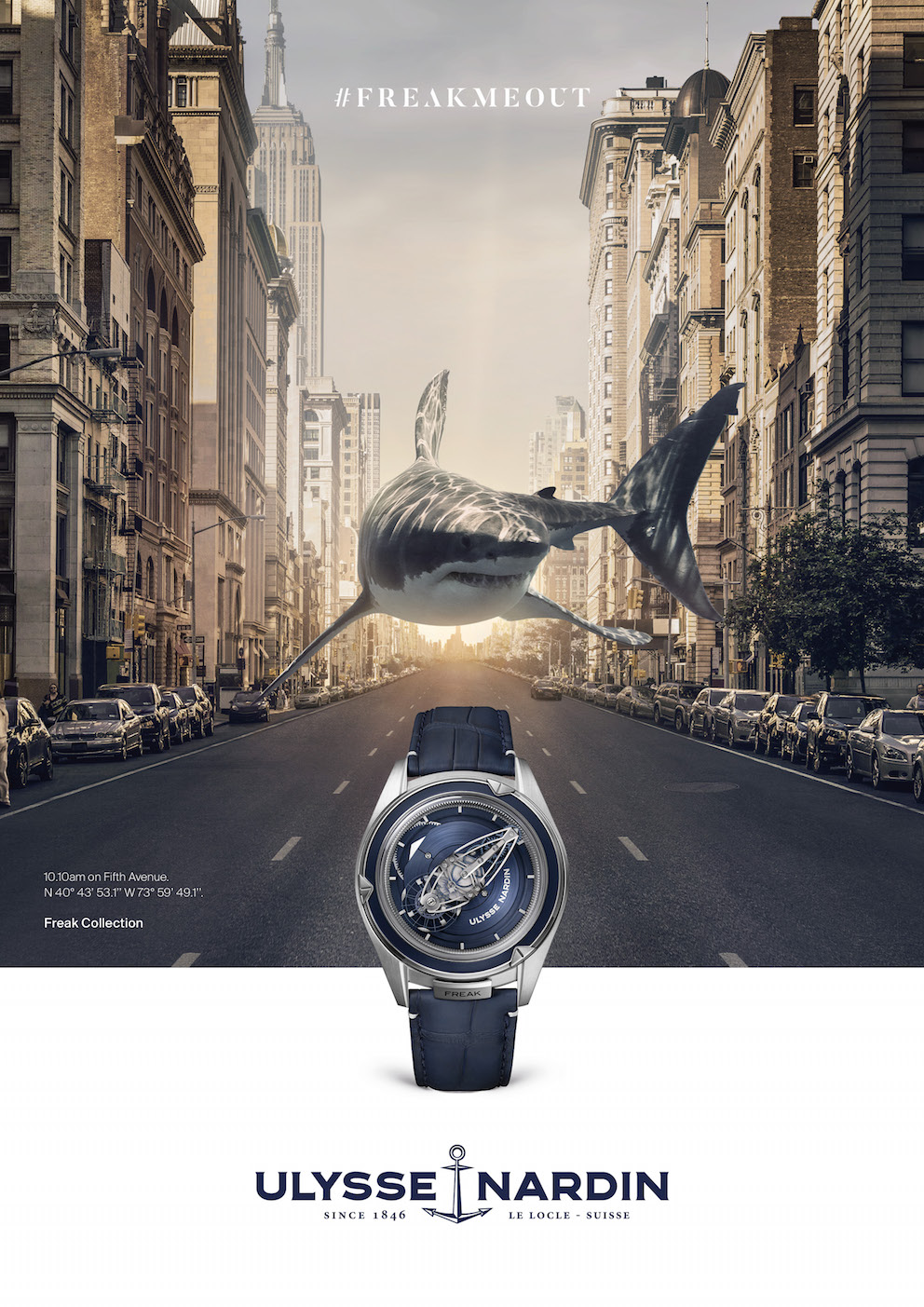 It’s here. The all-new Ulysse Nardin #Freakmeout ad campaign for digital and print makes its appearance this month worldwide. We recently wrote about the new campaign on our Perfect Timing column on Forbes.com. Now we bring you a close-up look at the wild and wonderful cutting-edge campaign that has sharks swimming through Manhattan and more.