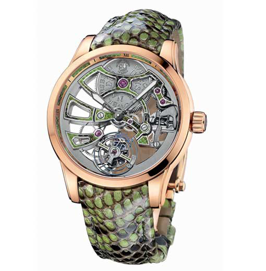 This new Ulysse Nardin watch is also a mesmerizing piece. With an overall exotic flair, the Royal Python Skeleton Tourbillon features python-inspired green painting on the bridges and a matching python-design leather strap. Created in a limited edition of just 18 pieces crafted in 4N 18-karat rose gold, the Royal Python Skeleton Tourbillon is a bold yet beautifully alluring timepiece. It is powered by the UN-170 Caliber with in-house developed flying tourbillon and silicium technology – including a silicium balance spring, anchor and escapement wheel. The manual winding watch also offers an amazing 170 hours o power reserve. A sapphire crystals and caseback allow for viewing of the superbly finished watch.