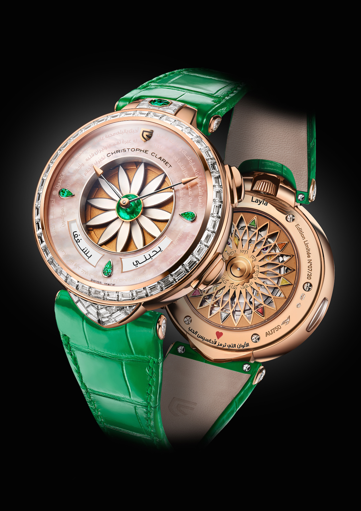 For women, this green machine is the newest Christophe Claret addition to the brand’s beloved floral collection. Called Layla, the design is a sumptuous work of elegance and technical prowess. The emerald and diamond beauty is a new version of the Margot watch, which is a mechanical masterpiece with which, with the push of buttons, the wearer can play a wonderful game of “he loves me, he loves me not” – with the petals disappearing from the dial and the answer being displayed at the base.