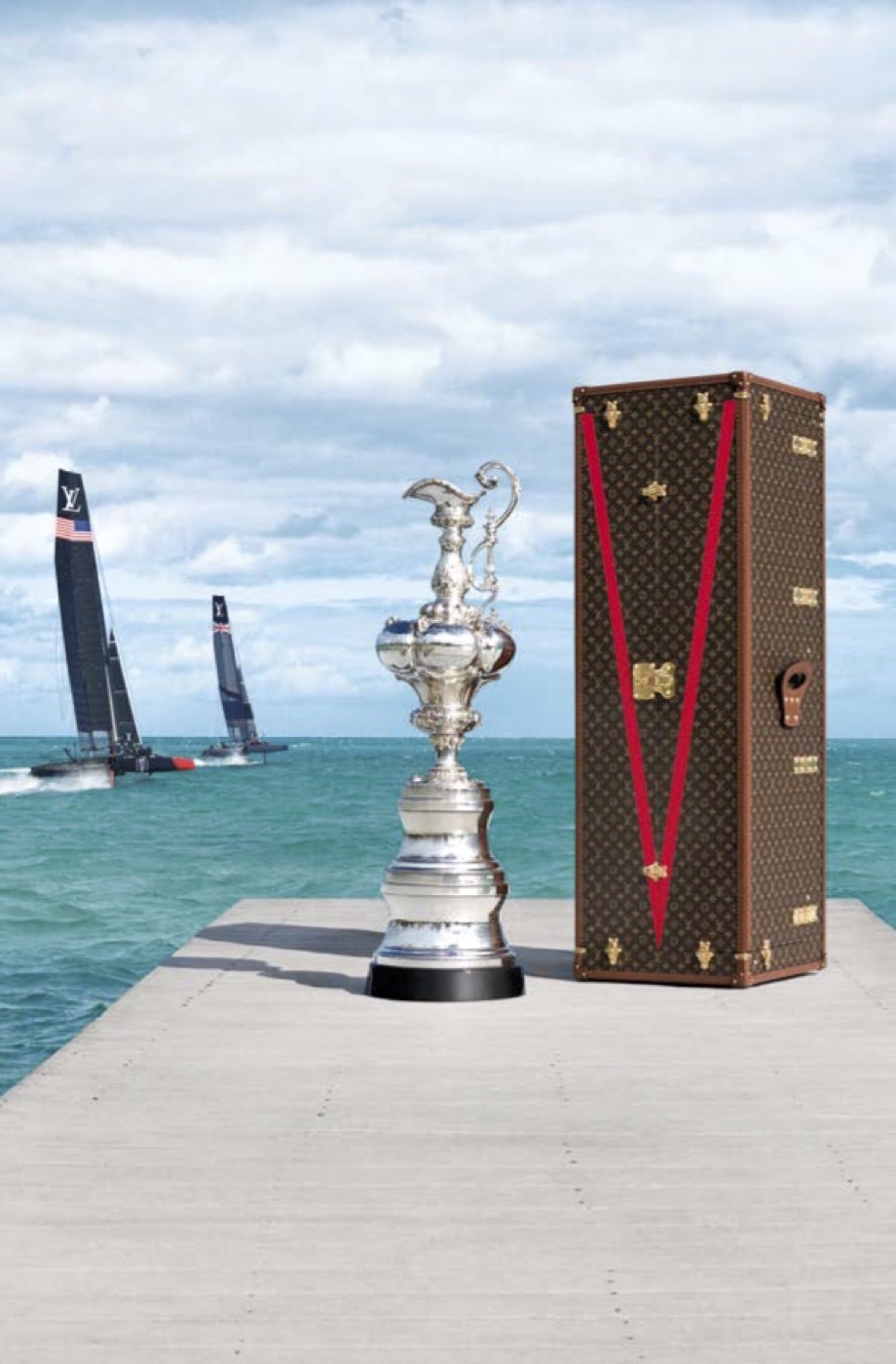 The new trophy is crafted in sterling silver. It weighs about 22 pounds and is just over two feet tall. Engraved on it are passing sails, as well as the famed Louis Vuitton Gaston ‘V’ mark (the symbol designed by Gaston-Louis Vuitton in the 1930’s to encapsulate the House’s values of Fly, Sail, Travel). The trophy was commissioned by Louis Vuitton to Thomas Lyte, a British goldsmith and silversmith.