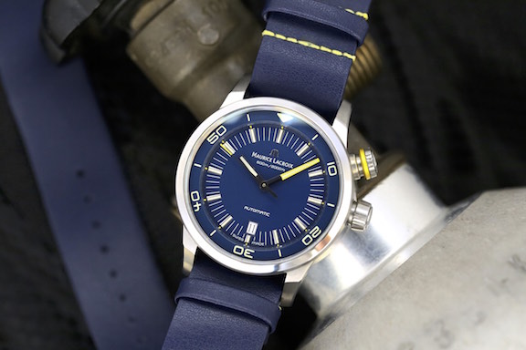 Affordability in a dive watch is something truly worthy of attention – especially when that dive watch performs well and looks great. Such is the case with the Maurice Lacroix Pontos S Dive “Blue Devil” watch. Water resistant to a massive 60 atm (600 meters), the watch features screw-down crowns for time adjustment and the internal rotating timing bezel, as well as a helium escape valve so that it can outperform its wearer. The bold Pontos S Diver features a blue dial, the best performing color in deep water. The yellow accent color is a top performing color for the various lighting conditions.
