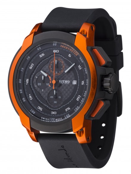 aluminum against a black PVD steel case. The colors – blue, bright orange or fire engine red are bezel accents that converge as lugs. The colors also carry over to het pushers, the strap tongs and – naturally the dial accents. Fitted with a Swiss quartz chronograph movement from Ronda, the Quantum 1 is a structural, architectural delight. It features a carbon fiber dial and a tachymeter scale on the inner ring. The watch offers a symmetrical appeal that is reminiscent of any great auto racing design. Stay tuned for more details on the Quantum II and III.