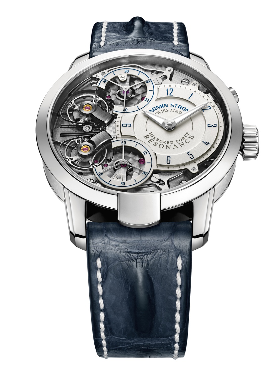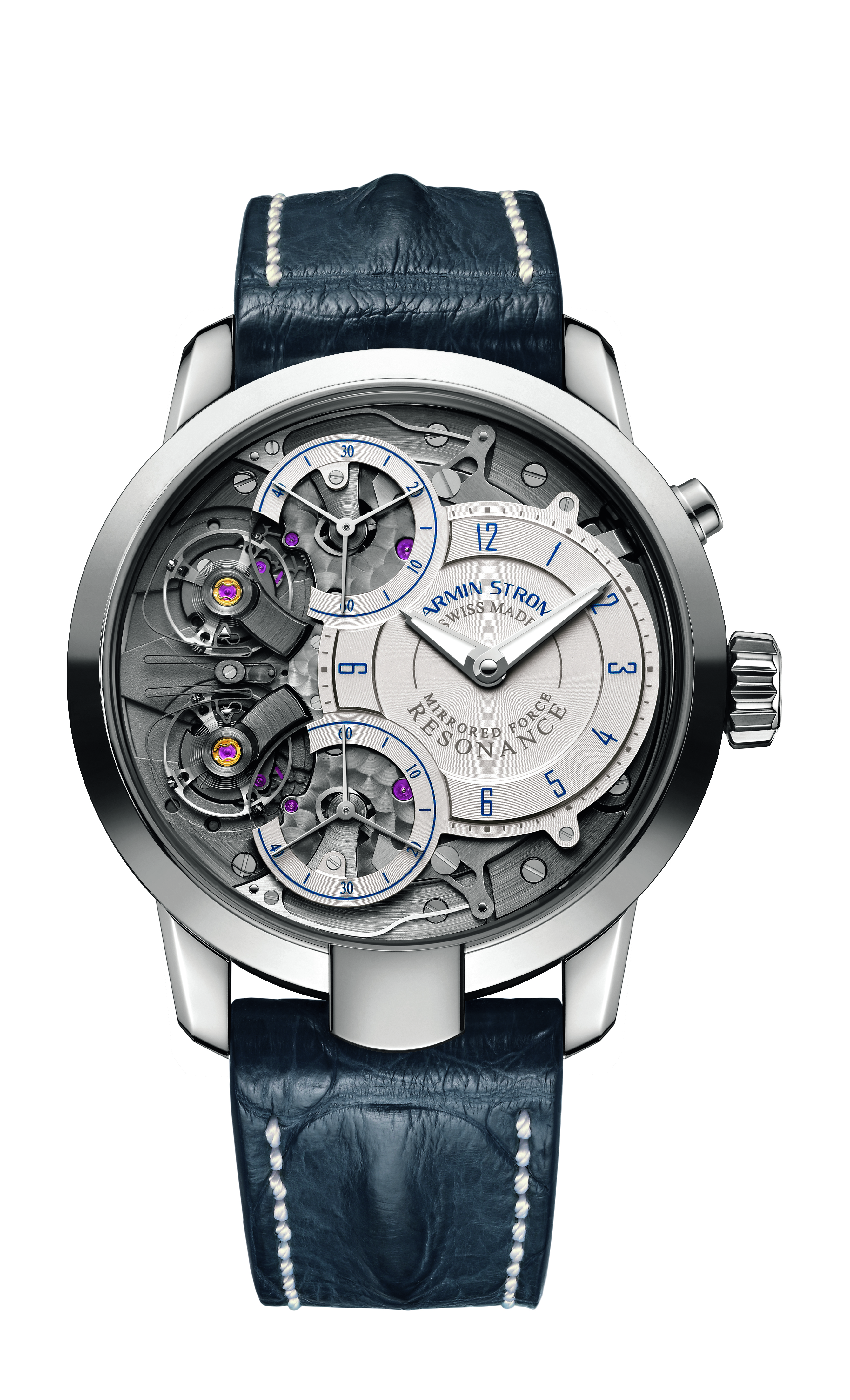 Offering a somewhatmore affordable version of its highly technical Mirrored Force Resonance watch (heretofore offered in rose gold), Armin Strom unveils the Mirrored Force Resonance Water watch — crafted in stainless steel. This model is also in keeping with the brand’s well-known “elements” concept, wherein it offers each watch in a material reflective of the four key Earth elements: Air, Water, Earth and Fire. The new Armin Strom Mirrored Force Resonance watch in steel is finished with a blue alligator strap for the water element.