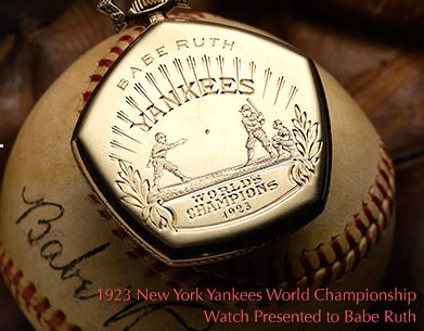 This may well be why one anonymous phone bidder spent a whopping $717,000 on a World Series Pocket Watch during this weekend’s Sports Platinum Night Auction by Heritage Auctions in New York. The pentagon-shaped 14-karat gold 1923 World Series pocket watch was originally part of a set that was given to Babe Ruth and his teammates after they beat the New York Giants in the 1923 World Series, wherein Ruth batted 368 and hit three home runs. The watch is engraved with a picture of a pitcher, hitter and catcher, as well as with a ball in flight, and is inscribed “Presented by Baseball Commissioner to George H. Ruth.”