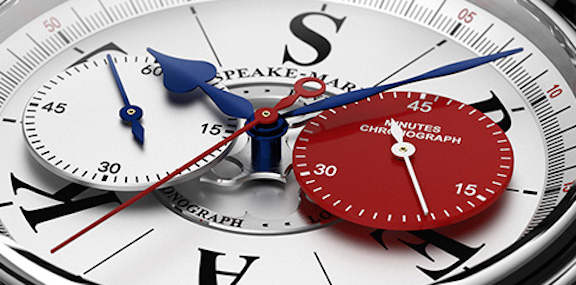The raised chronograph sub-dials on the London Chronograph give 3D depth to the dial, which Speake-Marin offers in British red, white and blue colors.