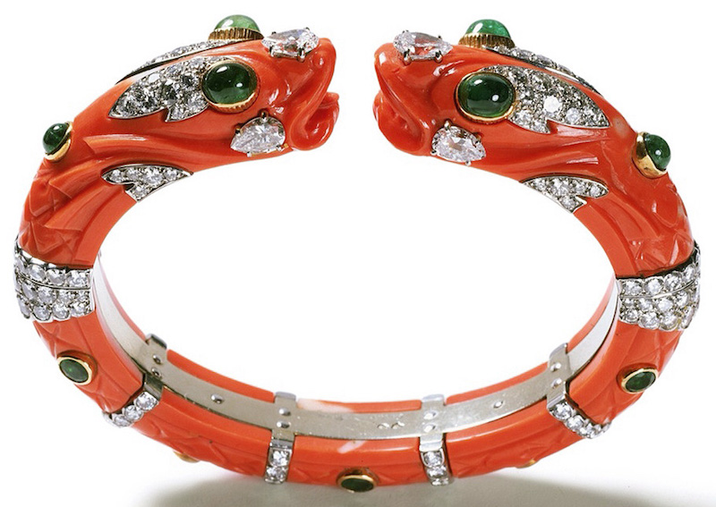 Chinese legend has it that a mythical form known as a chimera is the son of the dragon, with an appearance of a lion it is said to be a powerful protector that combats bad spirits. This bangle by Cartier Paris 1961 features twin chimera heads made of carved and engraved coral. The heads of the chimeras swivel to open and close the bangle, which features platinum, white gold, and yellow gold as well as both diamonds and emeralds.