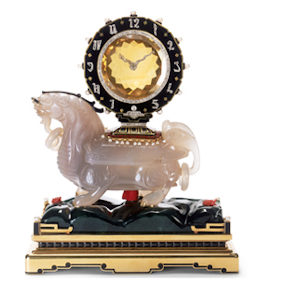 To the Chinese, nature is a source of wisdom. Made by Cartier Paris in 1926, the magnificent clock pictured above features a base of onyx holding a dial of white jade intricately carved with a Chinese landscape scene surrounded by a frieze of coral rods. The roman numerals are made of platinum and rose cut diamonds, as are the hands, one of which is shaped like a dragon. The clock features an 8-day movement, Swiss lever escapement, bimetallic balance, and Breguet balance spring.