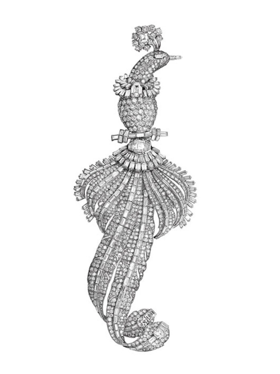Another mythical form prominent in Asian culture is the phoenix, said to embody purity and wisdom. When associated with the dragon the two creatures represent the imperial couple. This brooch which was made special order by Cartier Paris in 1948 is made of platinum and white gold and features an emerald-cut diamond, two square-shaped diamonds, and 991 baguette-, brilliant-, and fancy-cut diamonds.