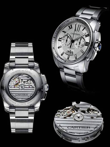This year, Cartier moves ahead – big time. The brand has unveiled here at the SIHH 2013 so many incredible new pieces that it will take some time to sort it out and get the info to you. But that’s ok; most of the watches won’t be available for sale until 6 months or more down the road. As such, we wanted to showcase one of its classical, sporty chic new watches today—the Calibre de Cartier Chronograph. The 42mm watch is fitted with a fully in-house manufactured caliber, the column-wheel chronograph (1904-CH MC) with a central vertical clutch. It is offered in either steel or gold, with or without gemstones. Unveiled by Cartier’s head of fine watchmaking Carole Forestier-Kasapi, who won the 2012 Geneva Grand Prix award for best watchmaker, the Calibre de Cartier Chronograph features a double-barrel power source that offers a more consistent torque during the 48-hour power reserve. In addition, Cartier integrates a linear return-to-zero hammer in this movement to guarantee instant, simultaneous and precise return of all chronograph hands, whatever the force exerted on the push-piece.
