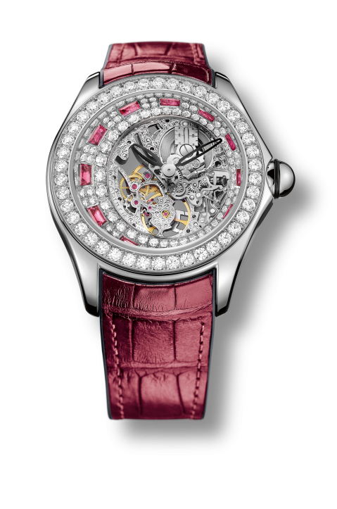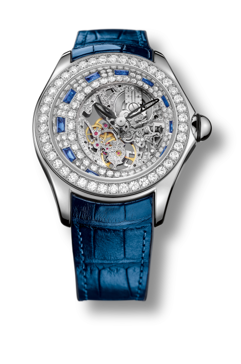 Three alluring alluring diamond- and gemstone-set Bubble watches with open-worked, ultra-thin movements steal the limelight: one each set with red rubies, blue sapphires and black sapphires. Each watch is meticulously set with131 brilliant-cut diamonds on the dial, another 42 on the bezel, and the added colored gemstones — more than 5 carats of stones each.