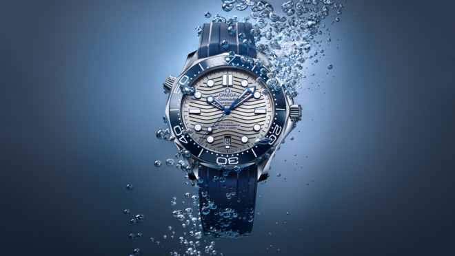 The aesthetics of the dial of the watch also boast a number of changes. They come in three variants, black, blue and sun-brushed PVD chrome color. Additionally, the Skelton hands are either rhodium plated, 18k gold, or blued. In a nod to the original design, the face of the watch now features the classic wave design, however the new model takes advantage of current technology and is laser engraved. The date window is at the 6 oclock position and all 12 indecies and hands are treated with SuperLuminova for low light visibility. To ensure that the piece stays on the wrist during the most physical of activities, the metal bracelet has Omega’s patented extendable foldover rock and pusher with diver extension for when the piece is worn over a dive suit.The back of the piece features an exhibition case back with the movement on full display and each piece is presented on either the classic metal strap or integrated blue or black rubber strap. The Seamaster Diver 300M watches range in price from $4,750 to $9,700.