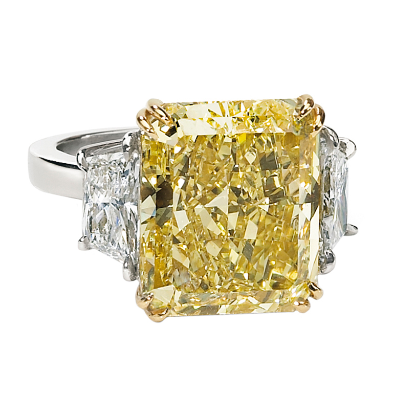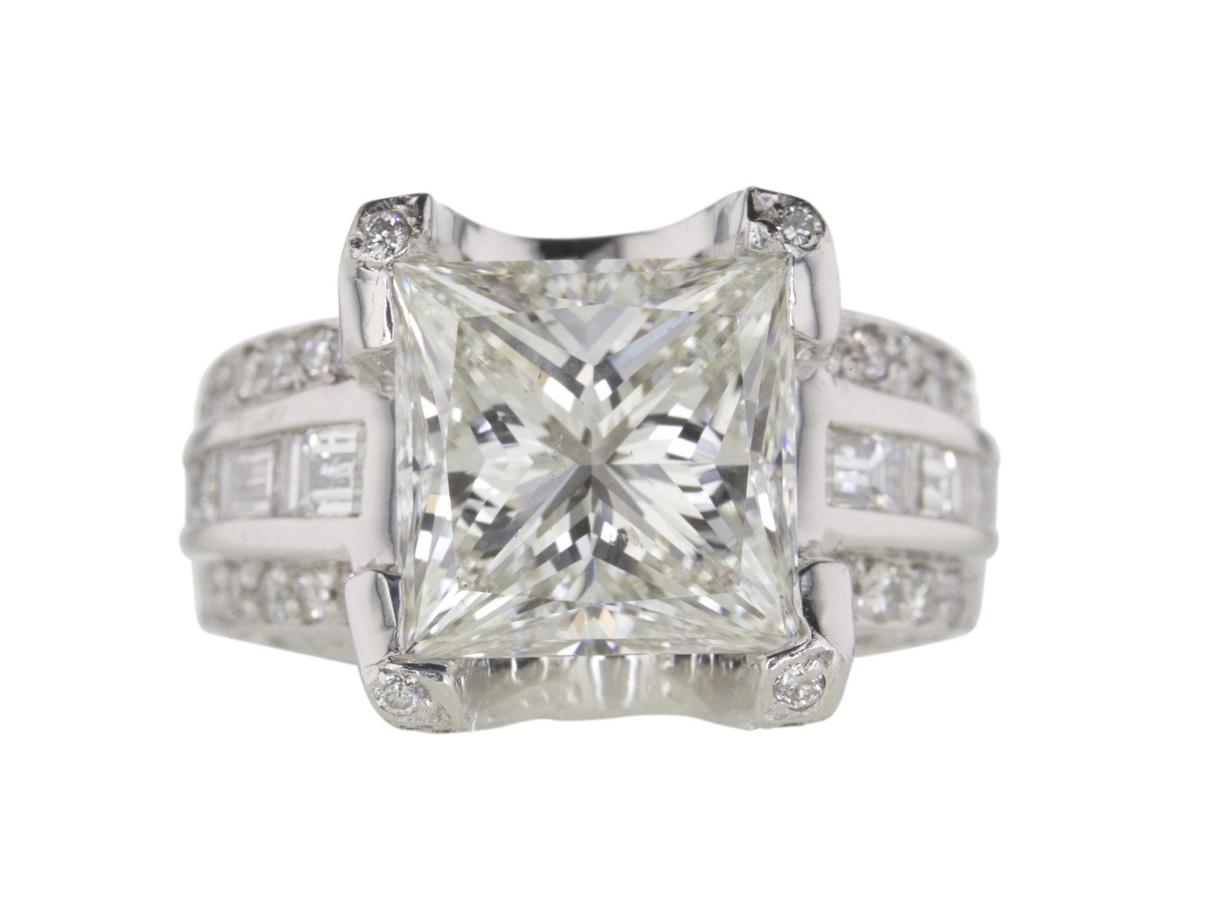 GIA certified 10.01-carat radiant-cut 3-stone ring, sold at auction for $78,185. (Photo courtesy of Worthy.com)