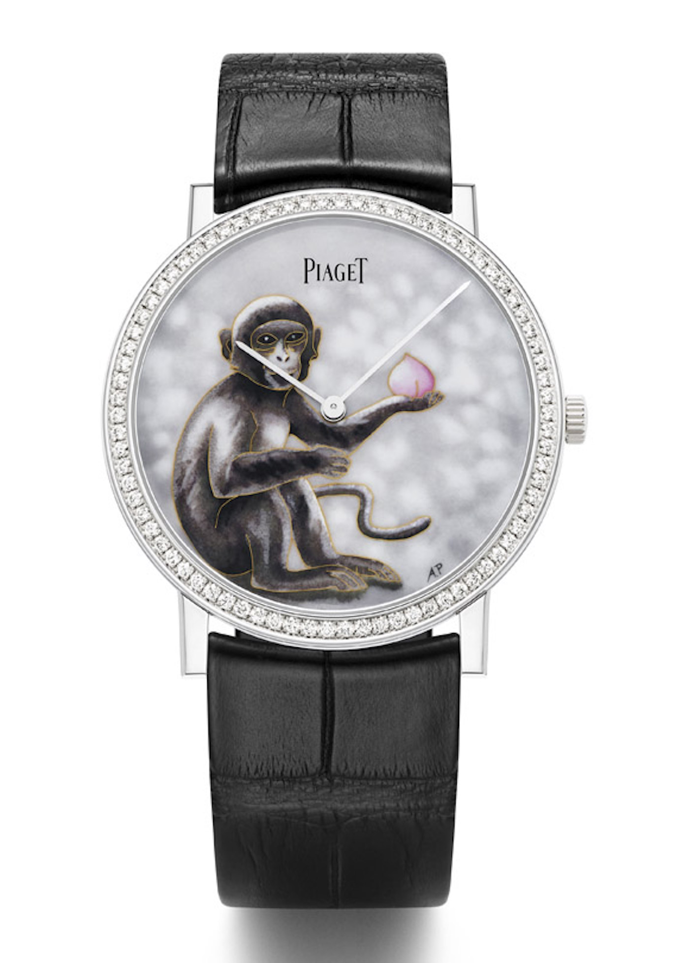 For the creation of this watch, Piaget turned to renowned master enameller Anita Porchet, who has brought the previous Chinese zodiac, signs to life for Piaget (dragon, serpent, horse, goat). Porchet uses cloisonné (the art of partitioning the enamel colors between thin lines of gold) for a more intense color hue and distinctive shading of gray for the monkey to attain its fur coat. In his hand he holds a peach, the symbol of immortality.
