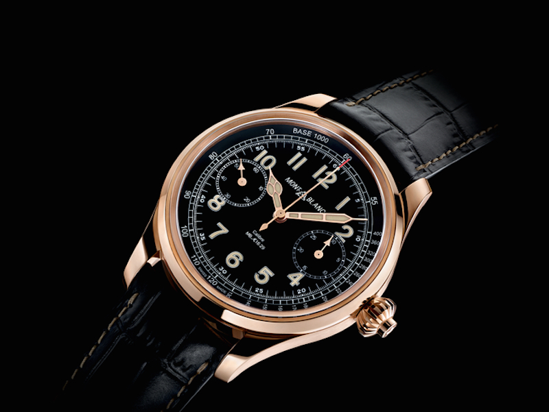 The 1858 Chronograph Tachymeter deftly combines elements of the past with today’s technology for a truly attractive watch. From the outside, the watch is a stunner—crafted in 18-karat rose gold with a black dial and characteristic-of-the-era large Arabic numerals. The chronograph subdials are displayed horizontally, with the chronograph minute counter at 3:00 and the running seconds at 9:00. At the 12:00 position, the bold Montblanc logo is derived from the historical brand emblem – complete with the Montblanc mountaintop breaking up the two-syllable name.