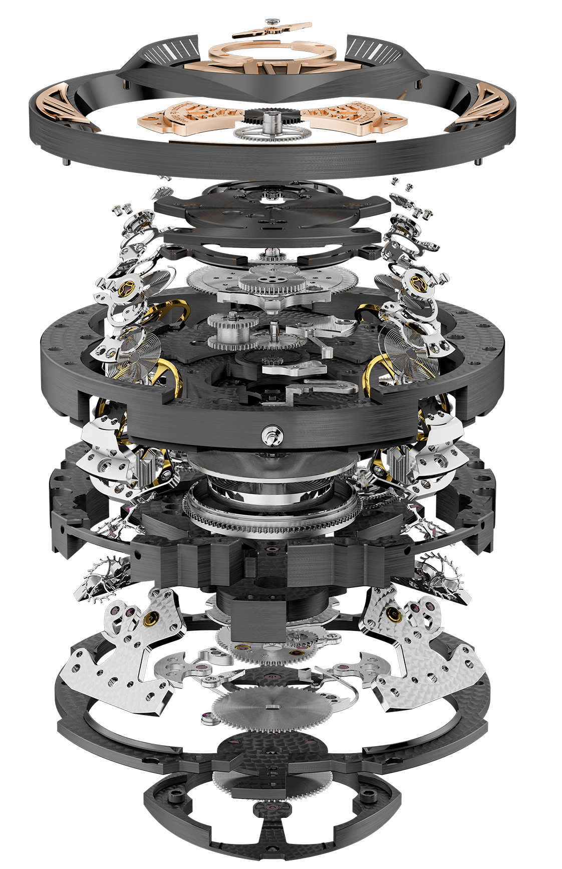 It takes approximately 2,400 hours to create the Excalibur Quatuor Carbon with four sprung balances watch, including 720 hours devoted to the fine finishing of the movement. Like all Roger Dubuis watches, it carries the Poincon de Geneve sea attesting to its high-standards of mechanics and finishing.