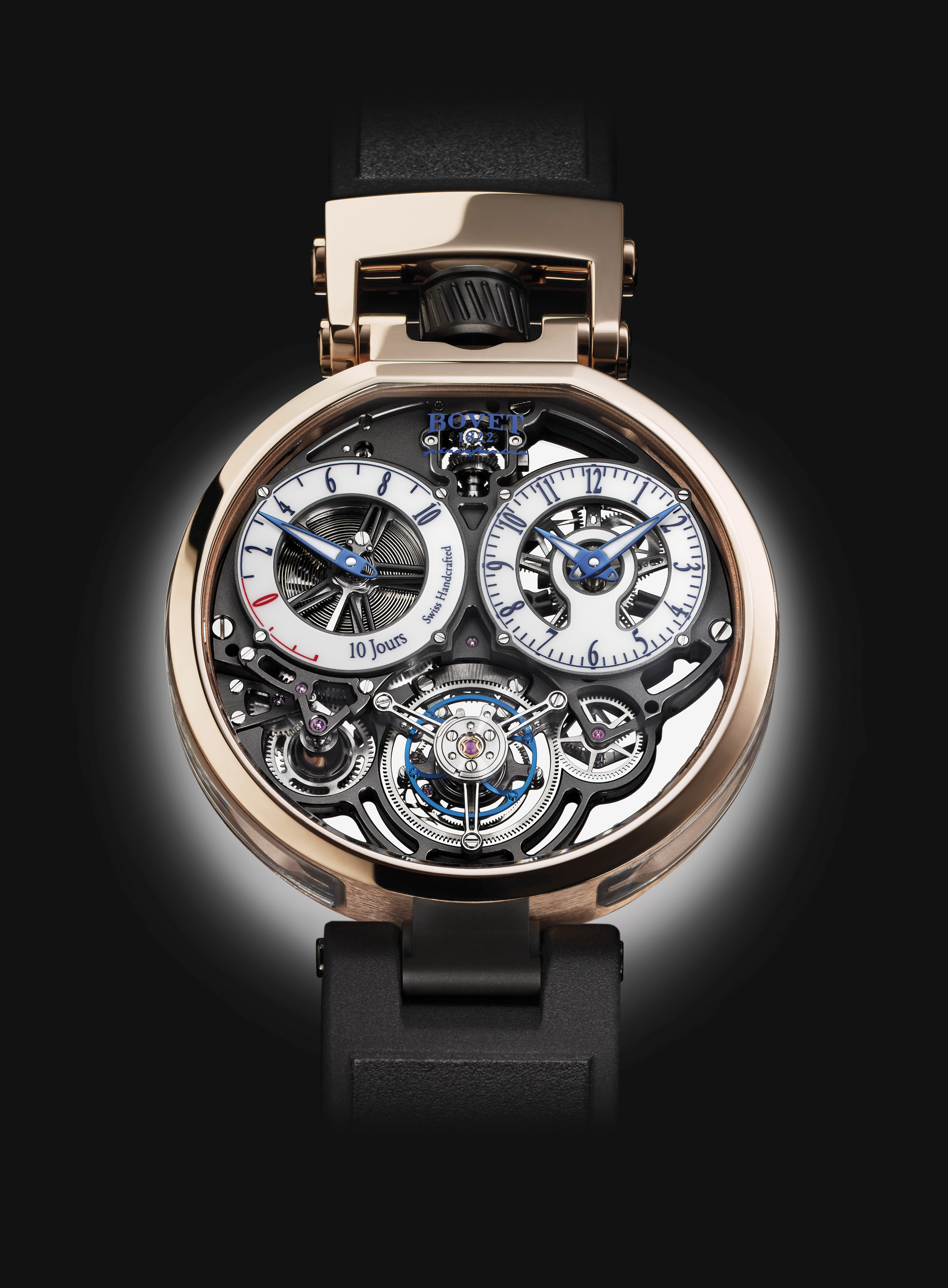 Every wheel in the gear train has been painstakingly angled and chamfered by hand, while the pivots of their axes are rolled in the traditional manner for quality and performance. The highly original flying tourbillon carriage is made up of 104 components. Its many innovations include a unique bridge at the center of its axis. In addition to its balanced masses and subsequently reduced lever effect, the tourbillon carriage seems to move more freely than ever before within its own space. This construction owes its existence to the patented double-sided tourbillon, which features the escapement and balance spring positioned on either side of the central fixation point, thus enhancing both the watch’s chronometric performances and aesthetic quality by clearly revealing the escapement and balance spring on both sides of the caliber.
