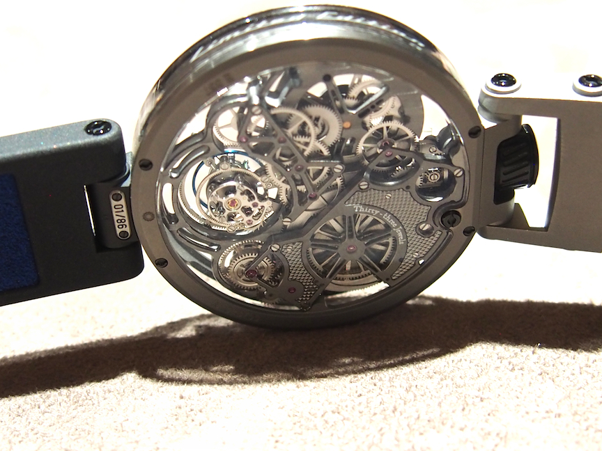 Other factors that underline the Tourbillon OTTANTASEI’s lineage to the BOVET by Pininfarina family include the finishes developed and designed specifically for the collection, which magnify the alternating surfaces and volumes of the movement. There are 34 shades — ranging from black to white — used on the various strata that make up the volume of this movement. The same applies to the bipolar Clous de Paris circular décor developed exclusively for the collection’s tourbillons, which is featured here in two sumptuous plates screwed to the barrel bridge. Each rendition — titanium, black DLC titanium, or gold — is built in a limited edition of just 86 pieces. A plate bearing the individual number of each movement will be meticulously screwed to the back of the 44mm case.