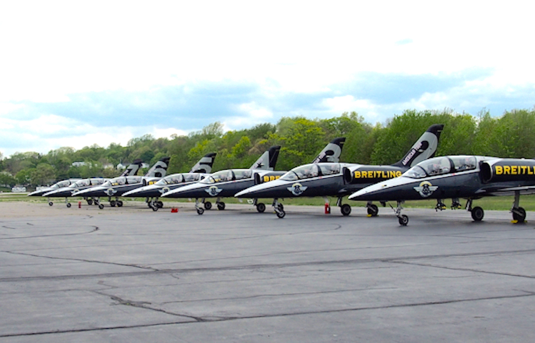 Perhaps what struck me the most when our seaplane touched down in Connecticut at the Tweed New Haven airport, was the fact that in front of us – perfectly lined up in majestic beauty – stood eight L-39 Albatros military training jets –noses pointed down, wearing Breitling blue and yellow colors and with eight pilots and eight mechanics standing formation in front of the jets. It was a like a scene straight out of the movie Top Gun, and I was immediately struck by the fact that these are no ordinary pilots.