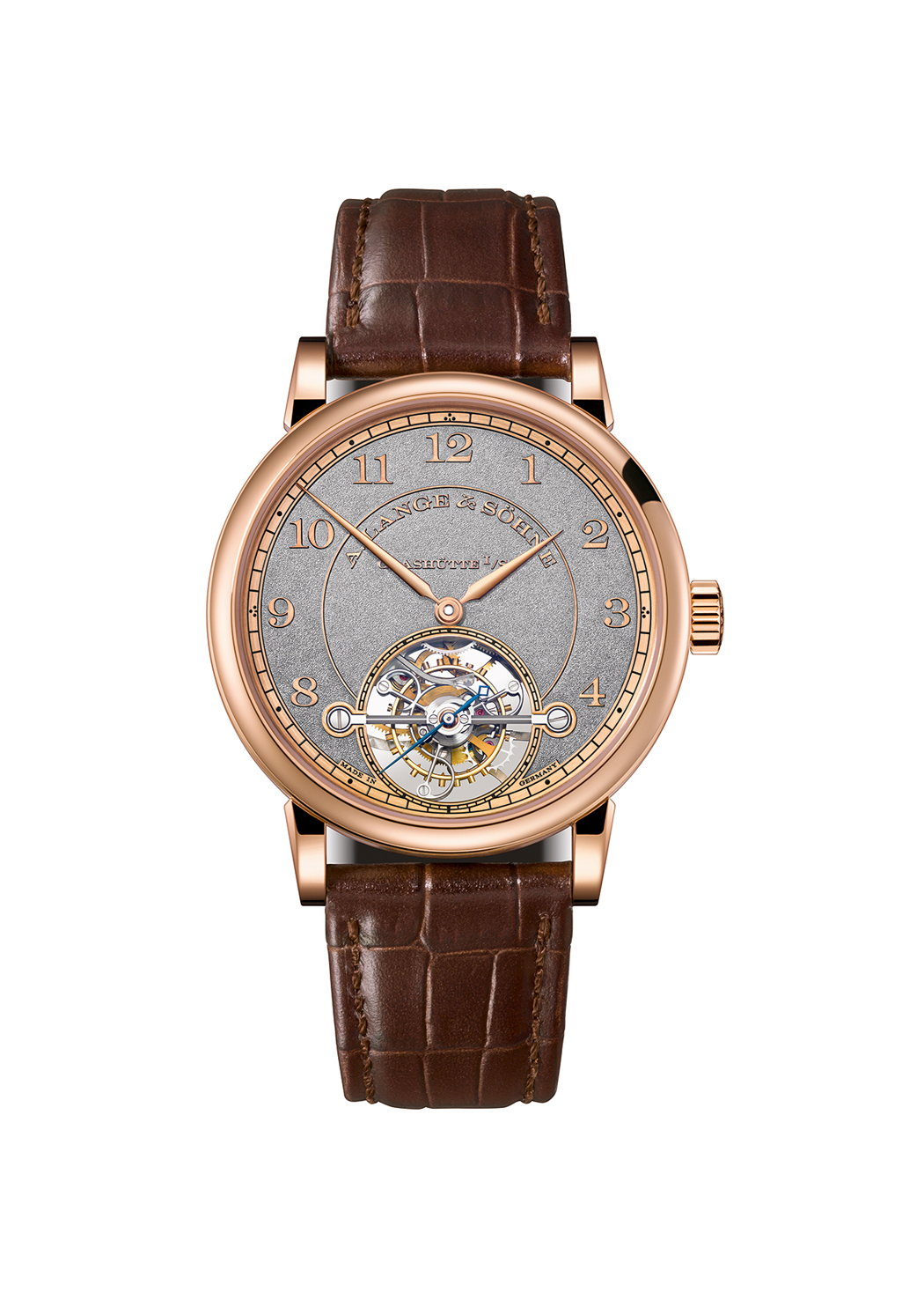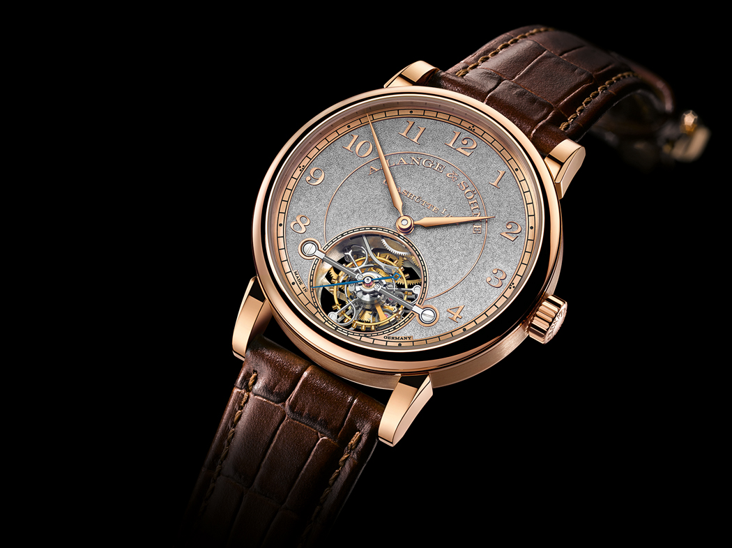 Powered by the L102.1 Manufacture caliber with granular surface three-quarter plate, the watch’s large one-minute tourbillon with patented stop-seconds is visible via an aperture at 6:00. Additionally, the tourbillon bridge and upper portion of the cage are also black-polished – an extremely time-consuming and lavish process. The watch is precision adjusted in five positions and features plates and bridges made of untreated German silver, inspired by historic pocket watches. The movement consists of 262 meticulously finished and hand-assembled components, including a lever escapement, 21 jewels (one being a diamond end stone) and five screwed gold chatons.