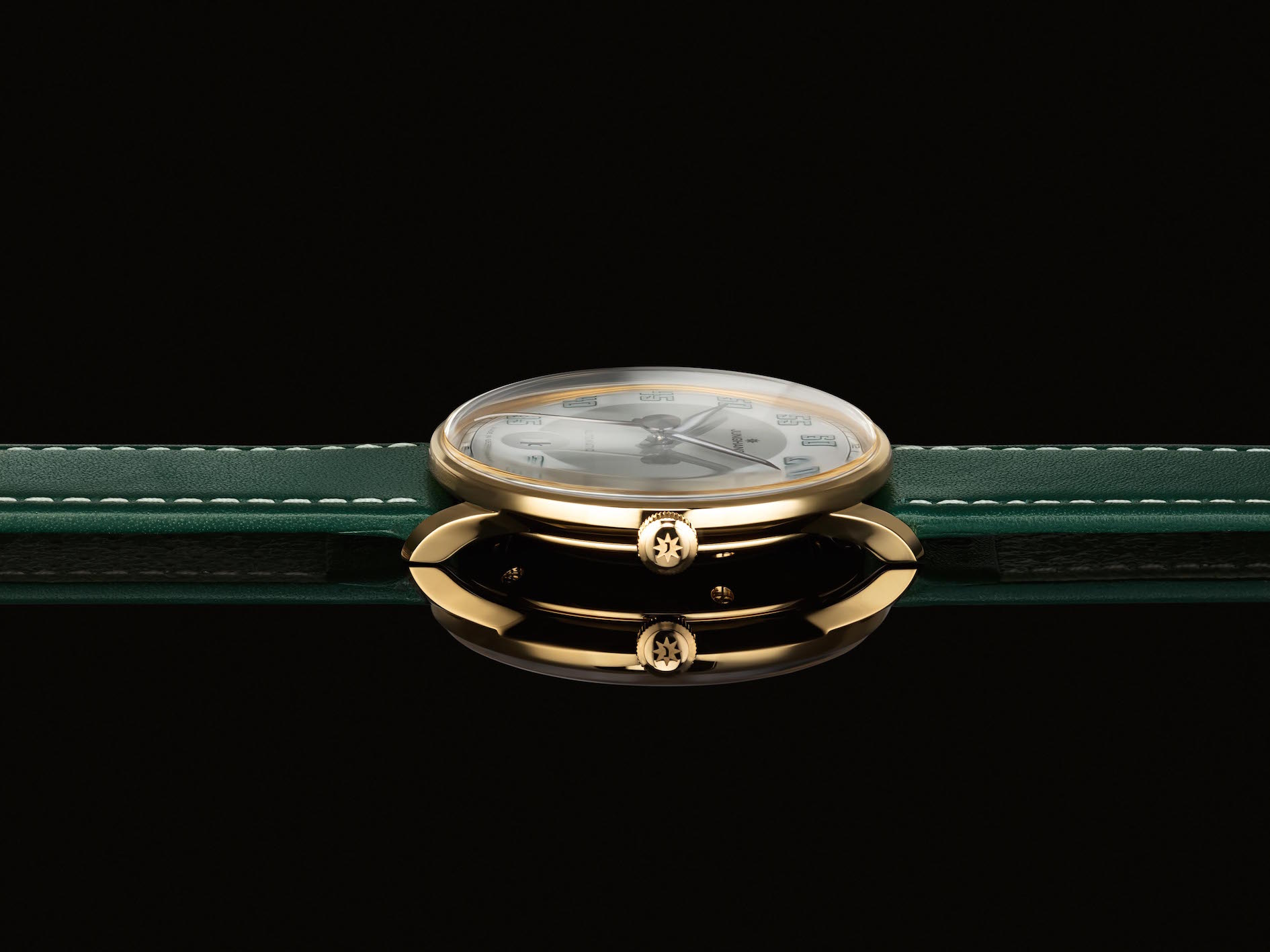 For the Meister Driver Automatic, Junghans has sought to capture the essence of the culture through astute color selection, as well as refinements and font selection for the numerals around the dial. Two colors ways have been produced: green and brown. For the green, British Racing Green is the dominant color, while the brown hue is meant to recall the leather cap and driving goggles of the race-loving gentleman. Both color options are housed in a gold–plated case measuring a refined 38.4mm.