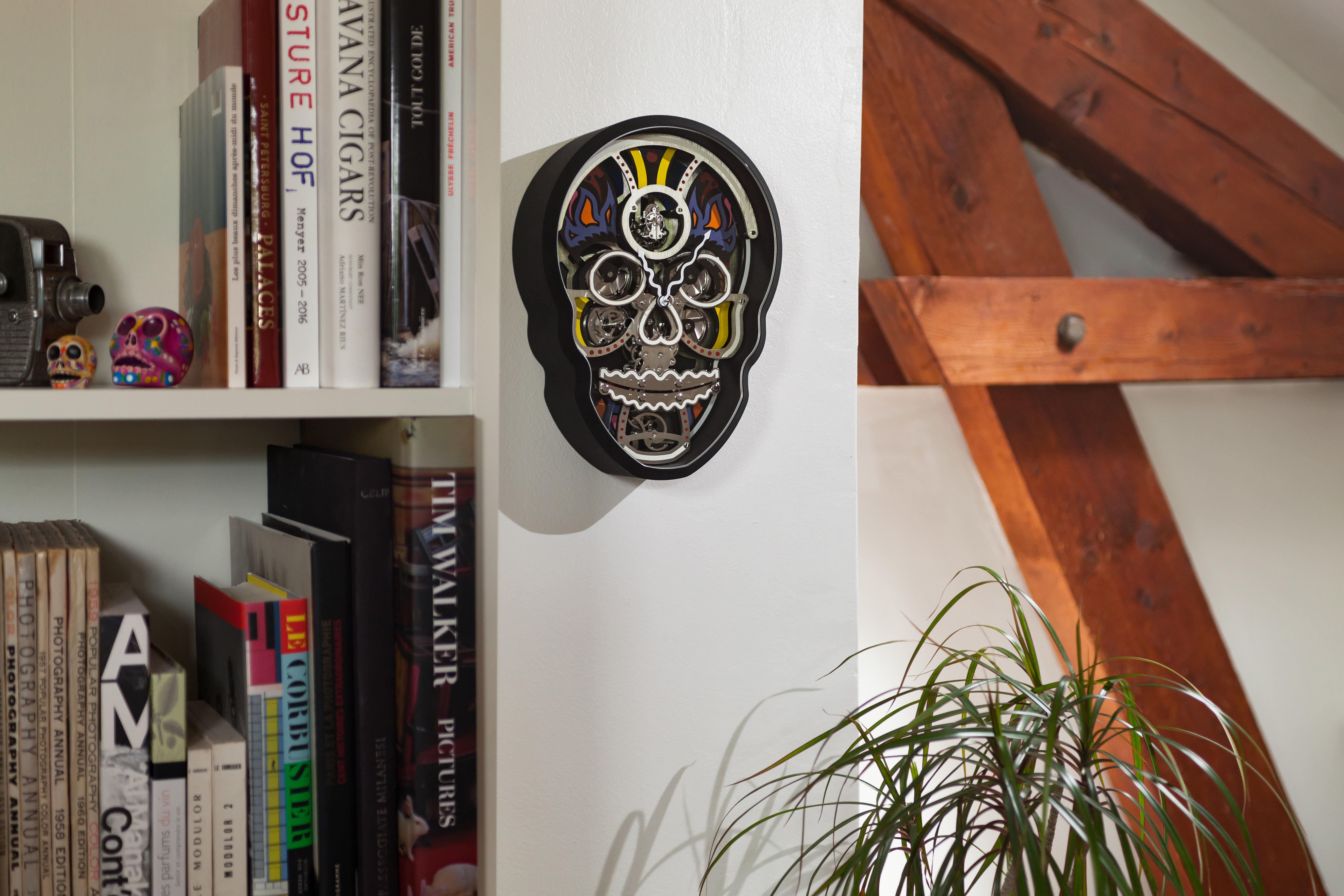 For both the dark and the colored models, the compoenets aree screen-prtinted with a pattern using gloss ink. The colors used are designed to represent a certain meaning specific to the Dia de Los Muertos celebration: Blue = Trust, White = Purity, Orange = Sun, Yellow = Death, Pink = Celebration, Red = Life and Purple = Grief and Black = Mortality. The clock will retail for $30,000.
