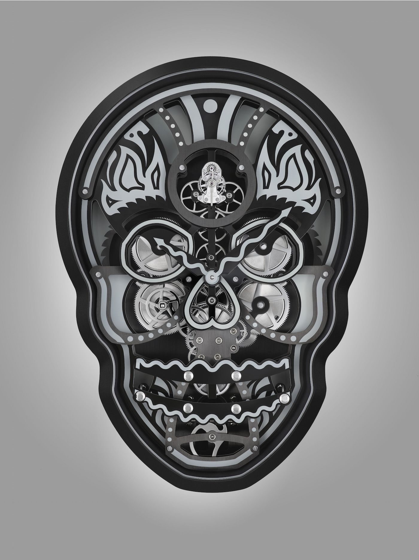 The Vanitas clock, designed by Kruger but engineered and crafted by L’Epée 1839, is designed to help celebrate life and time. It features a power reserve indicator that is integrated into the mouth of the skull. As the Vanitas clock loses power, it starts to yawn, indicating it is time to be wound. With 35 days of power reserve, this happens just about once a month. The yawning power reserve required a re-engineering of the clock movement, but offers a bit of delightful whimsy.