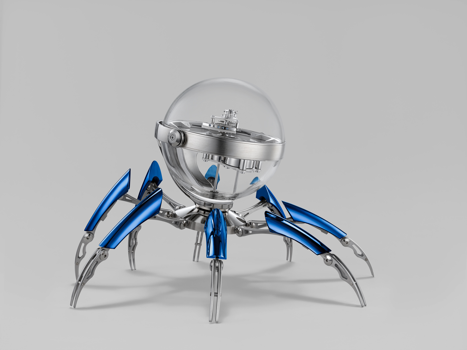 Seen here in the palladium version, the MB&F Octopod clock has legs that are adjustable to different heights.