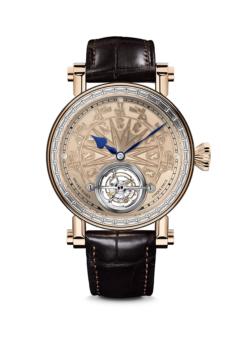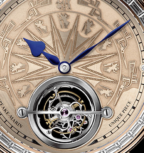 With the facts out of the way, let’s get to the emotions. This grandly etched dial, inspired by those bronze drums of prehistoric age, is an intricate and powerful work of art. Add to that, the stunning tourbillon with large aperture — in its constant dance — and you have a sure-fire winner. Says Speake-Marin, “The tourbillon is one of the elements that I love most about watchmaking because of the animation it brings to the dial. It shows time moving in a way that a minute-repeater or grande sonnerie can’t offer.”