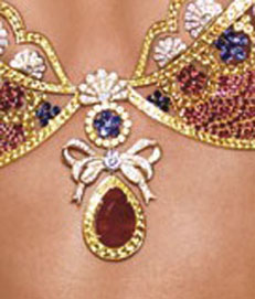 To create this piece, Mouawad reached back to the 1960’s to pay tribute to colorful wild and sexy looks. The suite is entirely hand crafted and consists of diamonds, rubies and sapphires set in 18-karat gold. The bra is finished with a 52-carat pear-shaped center ruby. The design is created by the family-owned Mouawad – which has been enchanting customers with its designs since 1890.