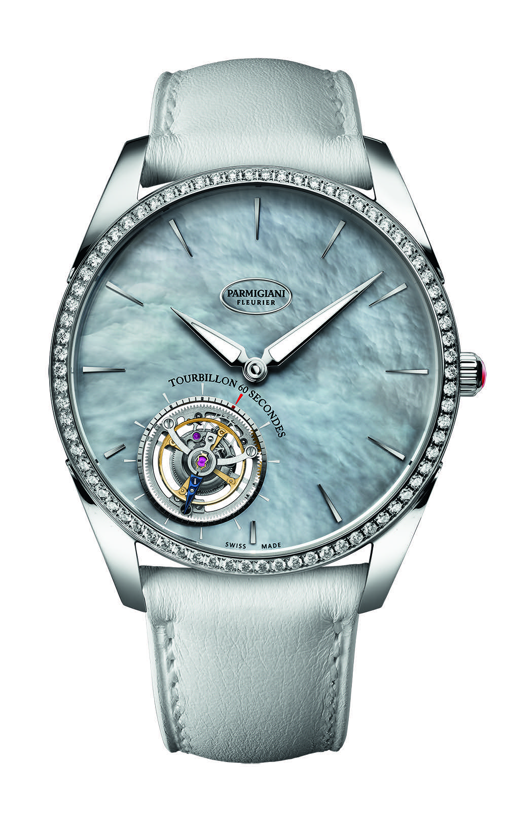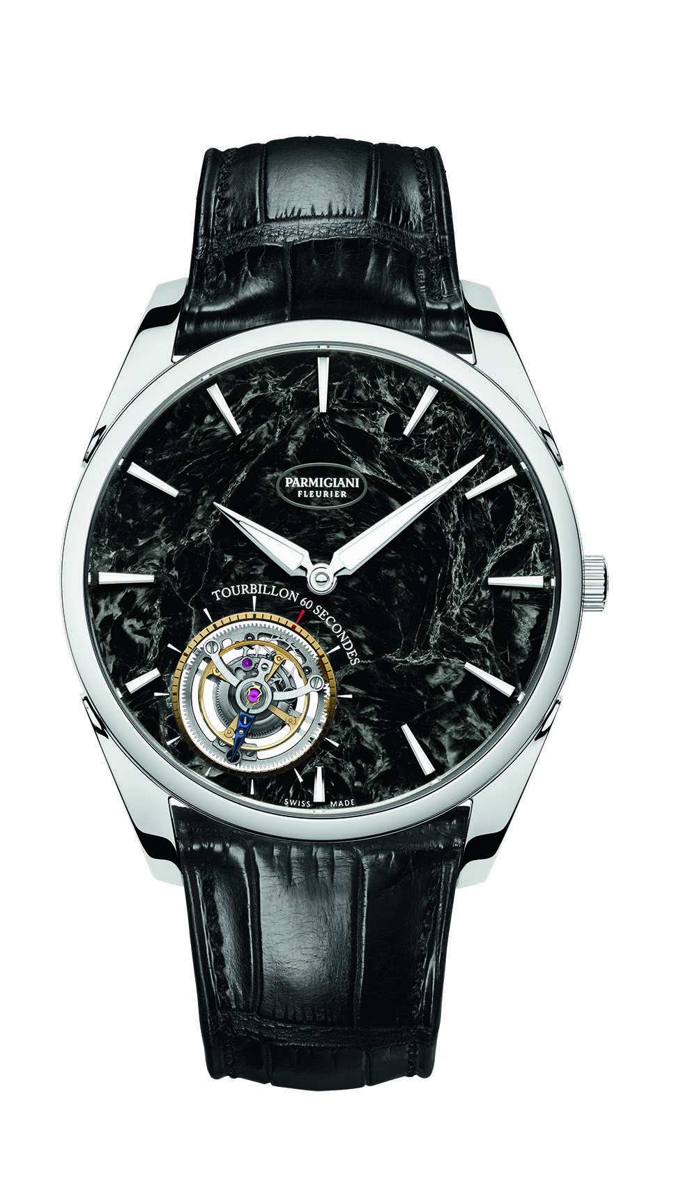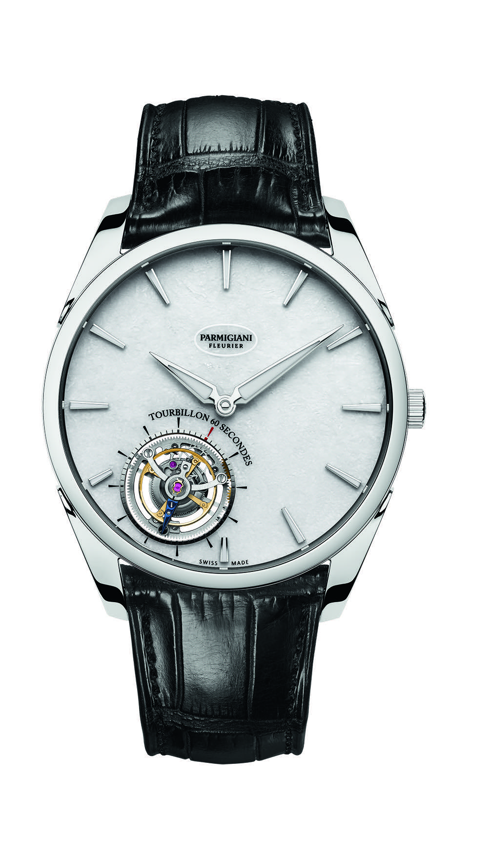 Additionally, in order to keep the time display at the center of the dial, Parmigiani had to create a flying tourbillon with a cage mounted on a single support bridge. In this tourbillon, a highly sophisticated ball bearing replaces the mounting function, and is flush with the dial surface — offering stunning visual movement.