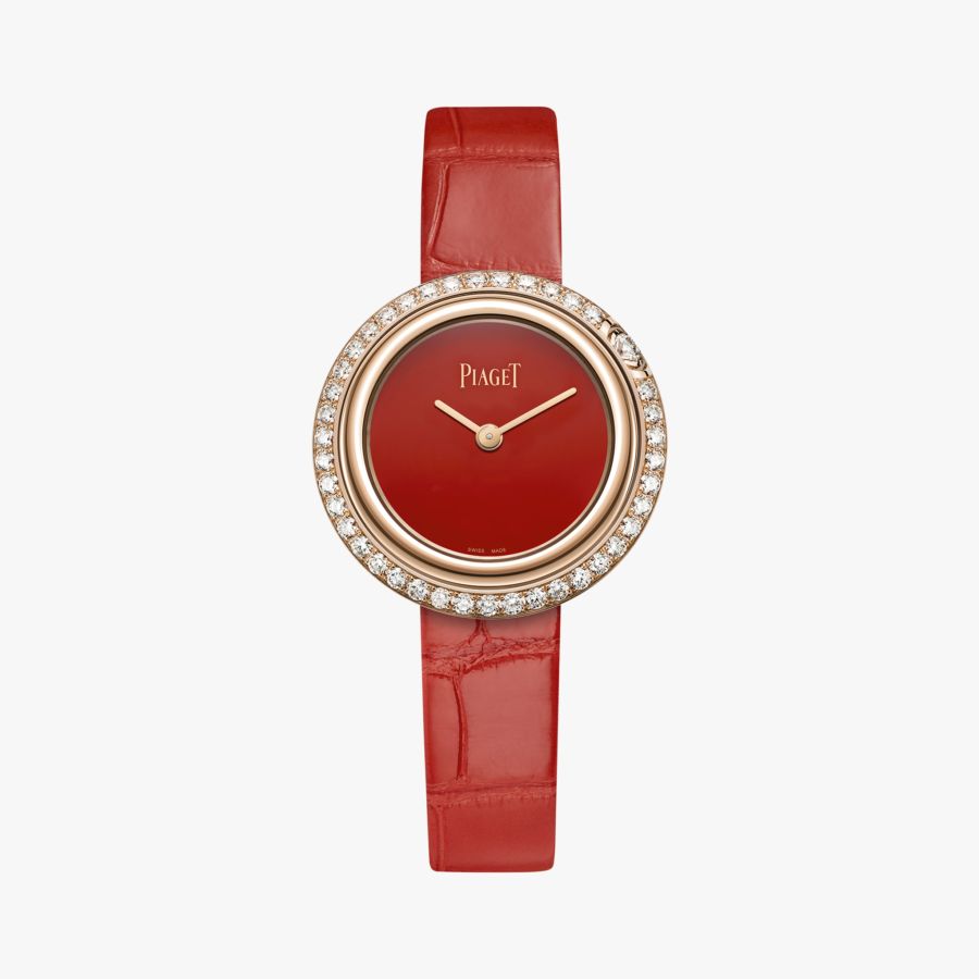 Piaget Possession watch, 29 mm in18K rose gold set with 42 brilliant-cut diamonds (approx. 1.04 ct). Natural carnelian dial, interchangeable straps. powered by the Piaget 56P quartz movement.