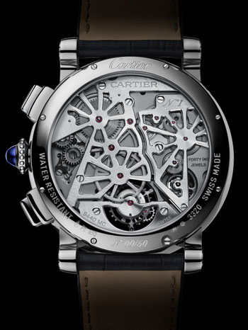 The simply dazzling dial is created of lapis lazuli and features a platinum grid in the form of the Roman numerals. The 47 mm watch is cased in platinum as only a true work of art should be, and features a sapphire crystal and caseback that allows for viewing of the movement. The crown is beaded in platinum and set with a blue sapphire cabochon. The watch is finished with an alligator strap and is water resistant to 30 meters. Just 50 numbered pieces will ever be made.