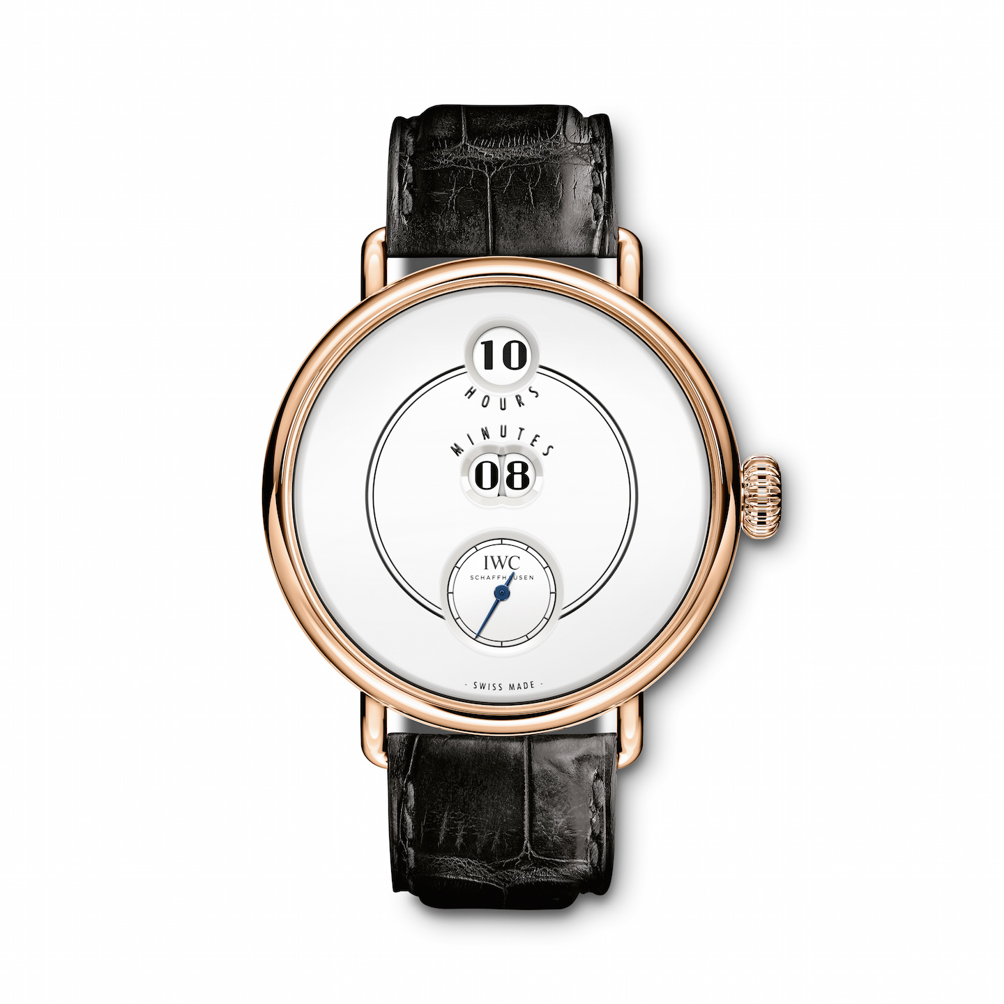 Crafted in 18-karat 5N rose gold, the technically advanced watch is the brand’s first ever wristwatch to house and original digital hours and minutes display – in the same configuration as it was built on the famed Pallweber pocket watches of 1884 that IWC created. The jumping numerals on the beautiful white lacquered dial are harmoniously designed with the small hours aperture at 12:00, the minutes aperture (via two windows) beneath it at the center of the watch, and the circular sub-seconds dial with outer track resides at the bottom at 6 o’clock. It is a clean, crisp digital indication of time via rotating disks.