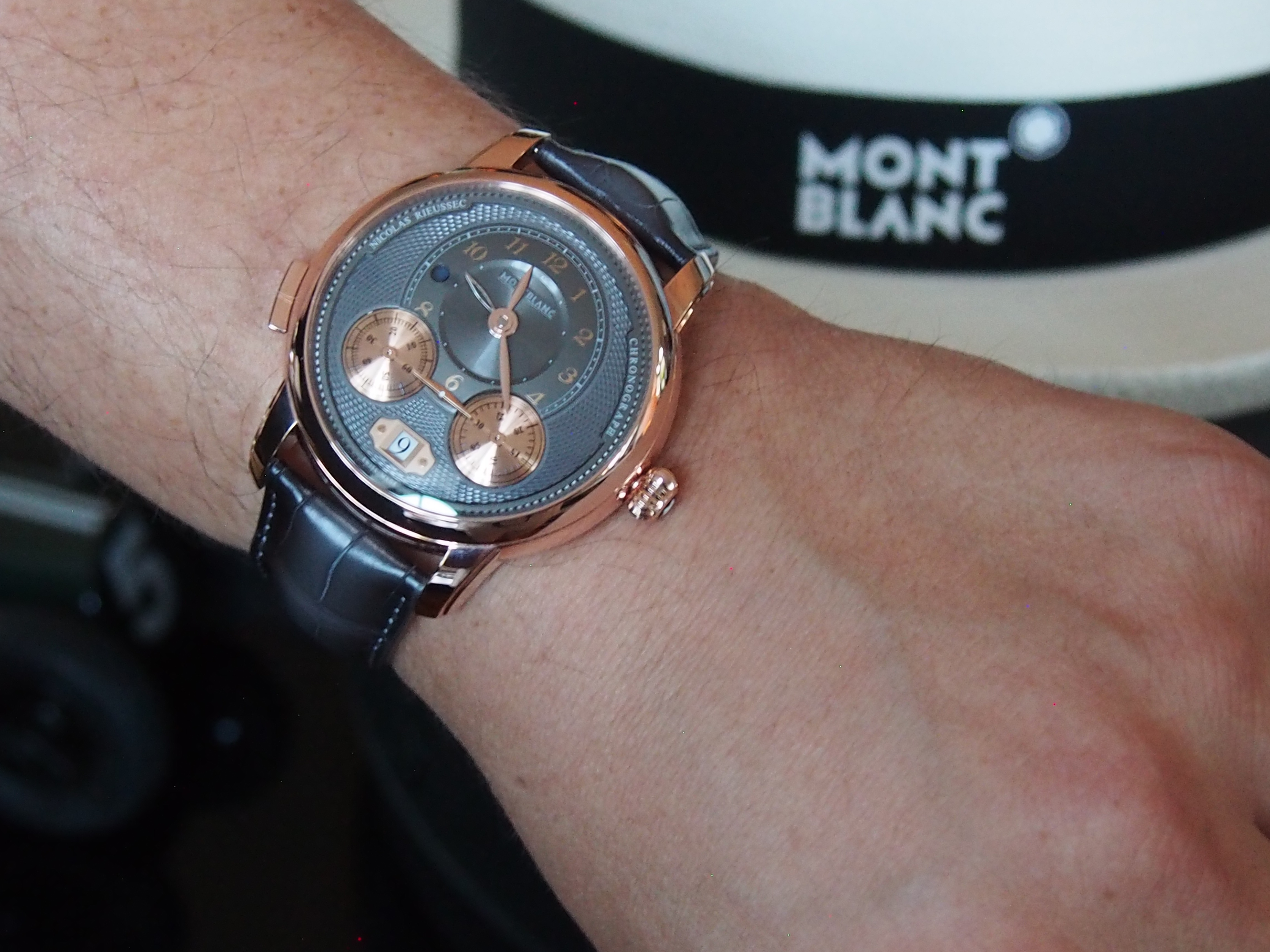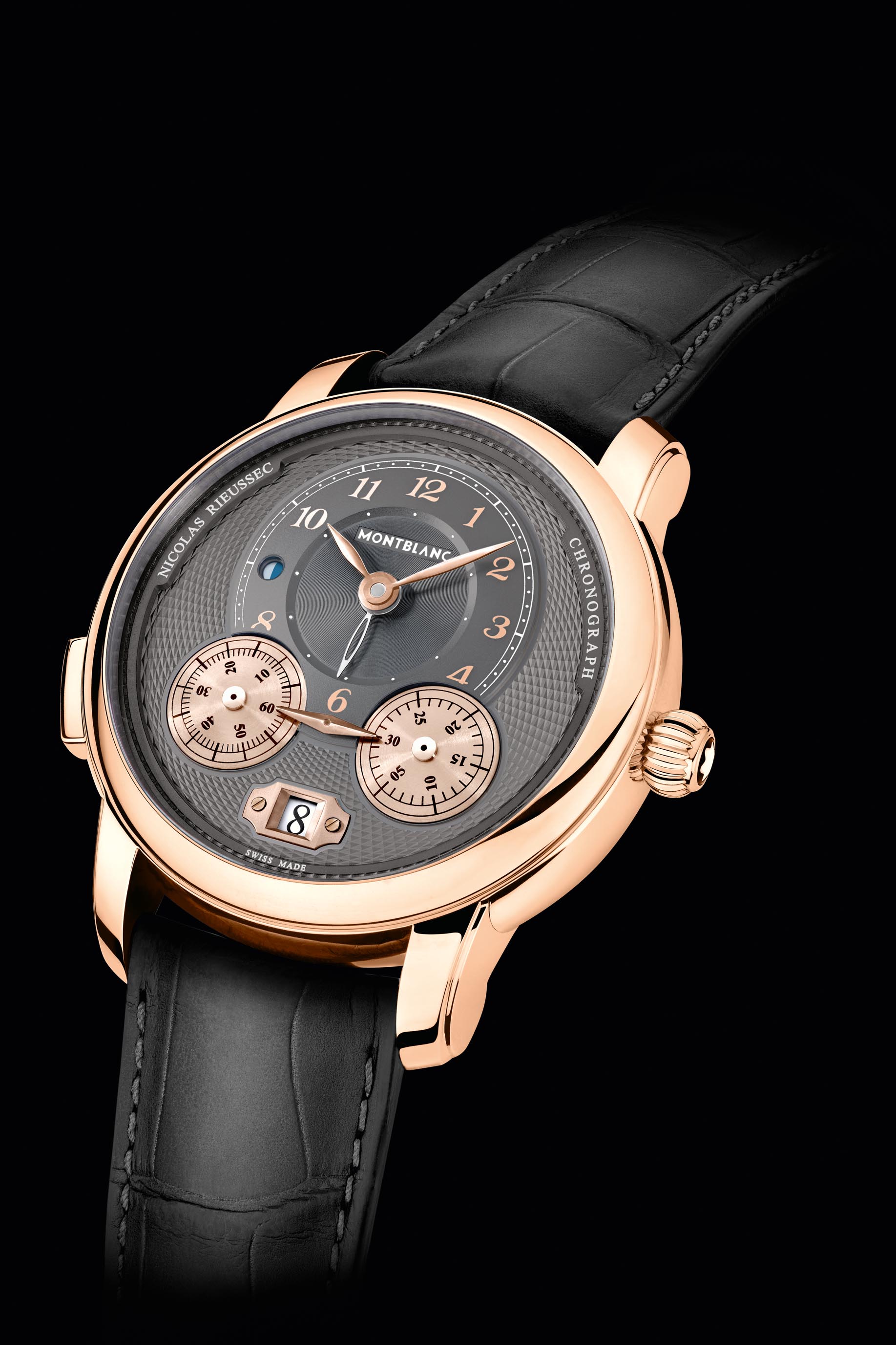 There is also a version in 18-karat rose gold with an anthracite dial. In this model, the hour circle, the hands and the chronograph counters are all coated in 5 N rose gold to match the case. The MB R200 movement in this case is fitted with a 5N rose gold coated oscillating weight. The 18-karat rose gold version retails for $22,650.This watch is so stunning up close and personal because the anthracite dial against the rich rose gold gives the dial a great hue. You can’t go wrong with any model in this collection — set to be in stores in mid 2019.