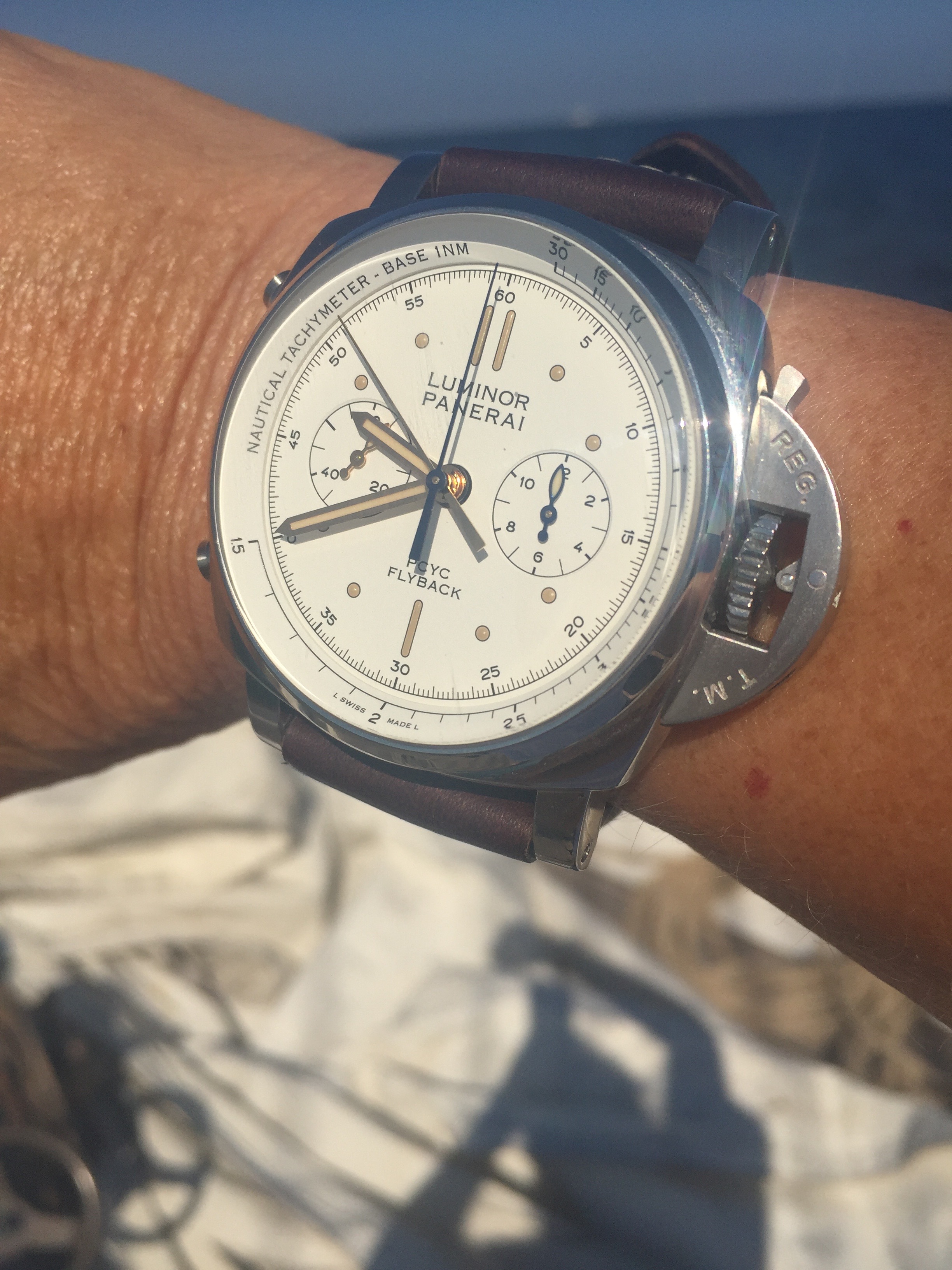 Nothing is as invigorating as spending a day on the water aboard one of the most beautiful schooners in the world – except spending the day racing on the water. Just a couple of weeks ago, I had the most unique experience of sailing in Nantucket during the 2017 Panerai Classic Yachts Challenge aboard the largest schooner in the Opera House Regatta: Eleonora. And, I got to wear one of the newest Panerai Luminor 1950 PCYC 3-Days Chrono Flyback automatic watches throughout the race.