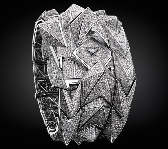 The Diamond Fury took the master artisans at Audemars Piguet more than 1,500 hours (months and months of time) to create. Its intricate lattice work inner cuff is built in the same pyramid motif (though all smooth and one dimensional for supple fit) as the raised diamond pyramids on the outside of the cuff. Two versions are being offered: one with diamond and onyx and one with all diamonds. The fully set version consists of a massive 4,635 brilliant-cut diamonds and weighs a total of 25.60 carats – enough to even get a little exercise when wearing it. It is powered by a quartz caliber — but we can forgive that simply because of the daring ingenuity of the watch. The diamond and onyx version sells for $568,300, while the all-diamond adorned masterpiece carries a retail price of $637,800 — a mere drop in the bucket for the truly rich.