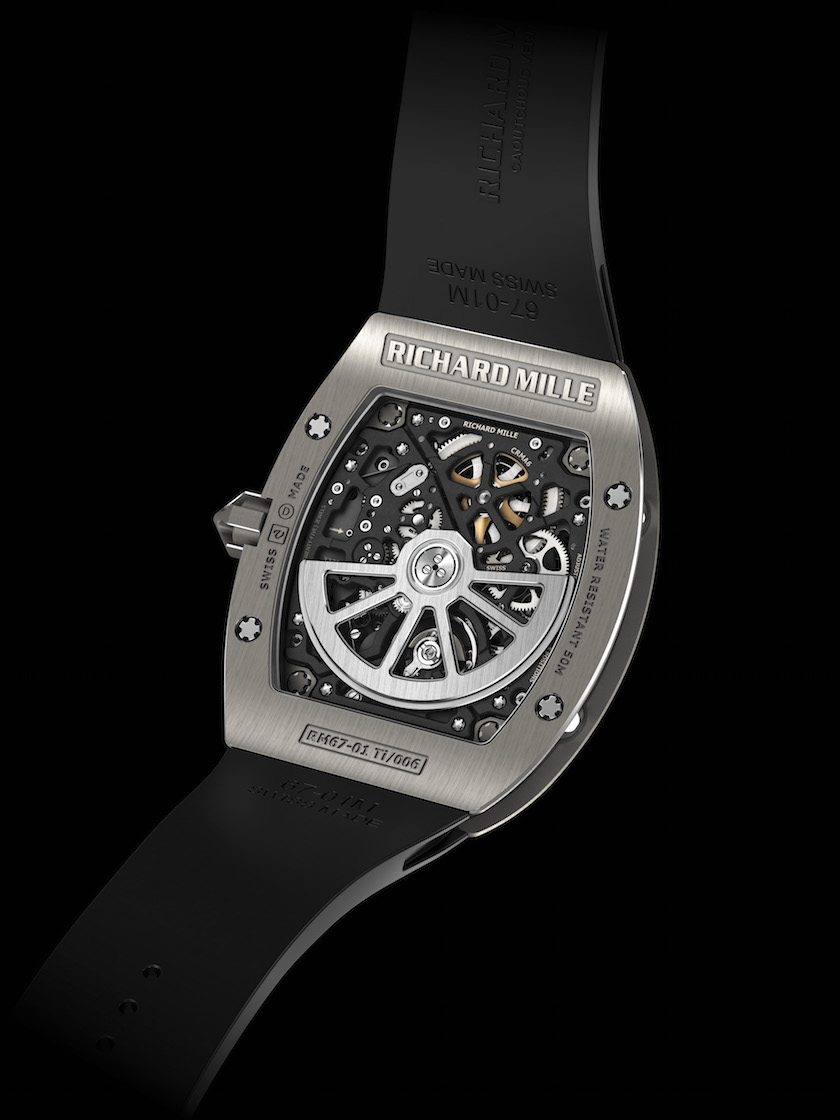 To power the ultra-thin piece, Richard Mille has developed an entirely new in-house movement with its engineers in Les Breuleux. Titled the CRMA6, the new movement is only 3.6 mm thick. Additionally, and in keeping with Mille’s history of working with exotic and durable metals, the base plate and bridges have been constructed from grade 5 titanium and finished with a combination of grey and black electro plasma treatment. The numerals also present an interesting story. They are crafted from solid metal, filled with Luminova and mounted on two linked and rigid titanium rails attached directly to the movement.