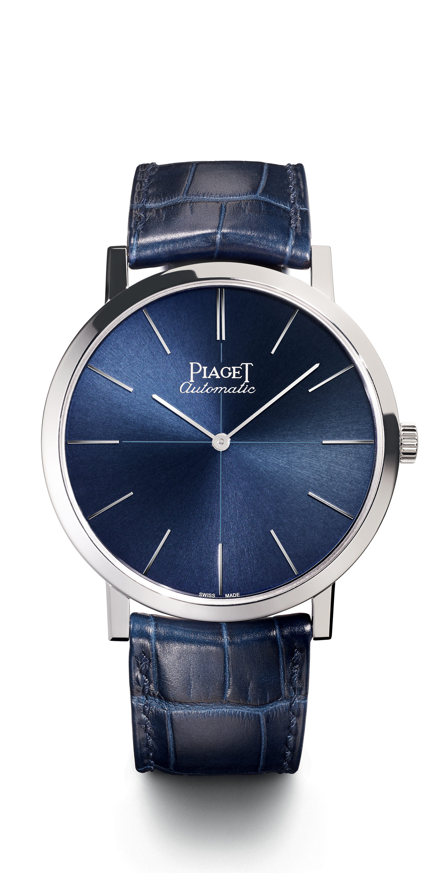 These premiere watches within the Altiplano 60th Anniversary Collection, while modern in their construction, recall the Altiplano’s earliest models via significant aesthetic details, including the Piaget logo at 12 o’clock, applied gold hour markers, and the signature “cross” that subtly divides the dial into quadrants. So, too, both watches have sunburst dials in “Piaget blue” and signature baton hands that elegantly traverse the dials.