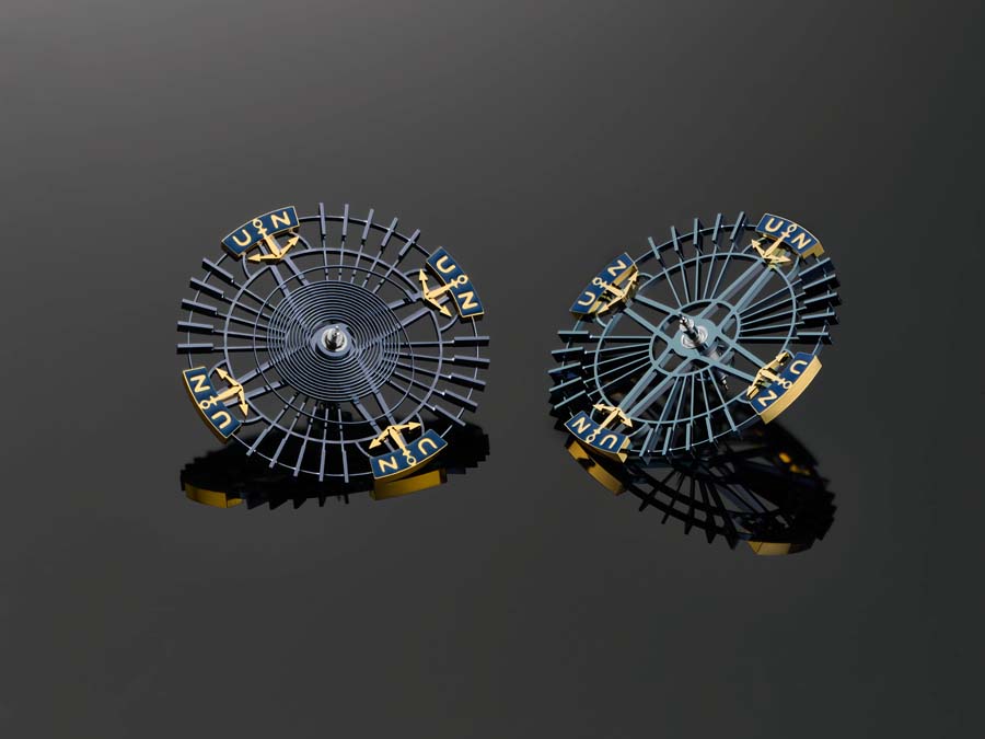 Silicium balance wheel with gold mass elements and stabilizing micro paddles (patent pending). Nonmagnetic Silicium, which has a density 3.6 times lower than Glucydur, is used for the balance wheel and balance spring, making them both shock resistant but also flexible.