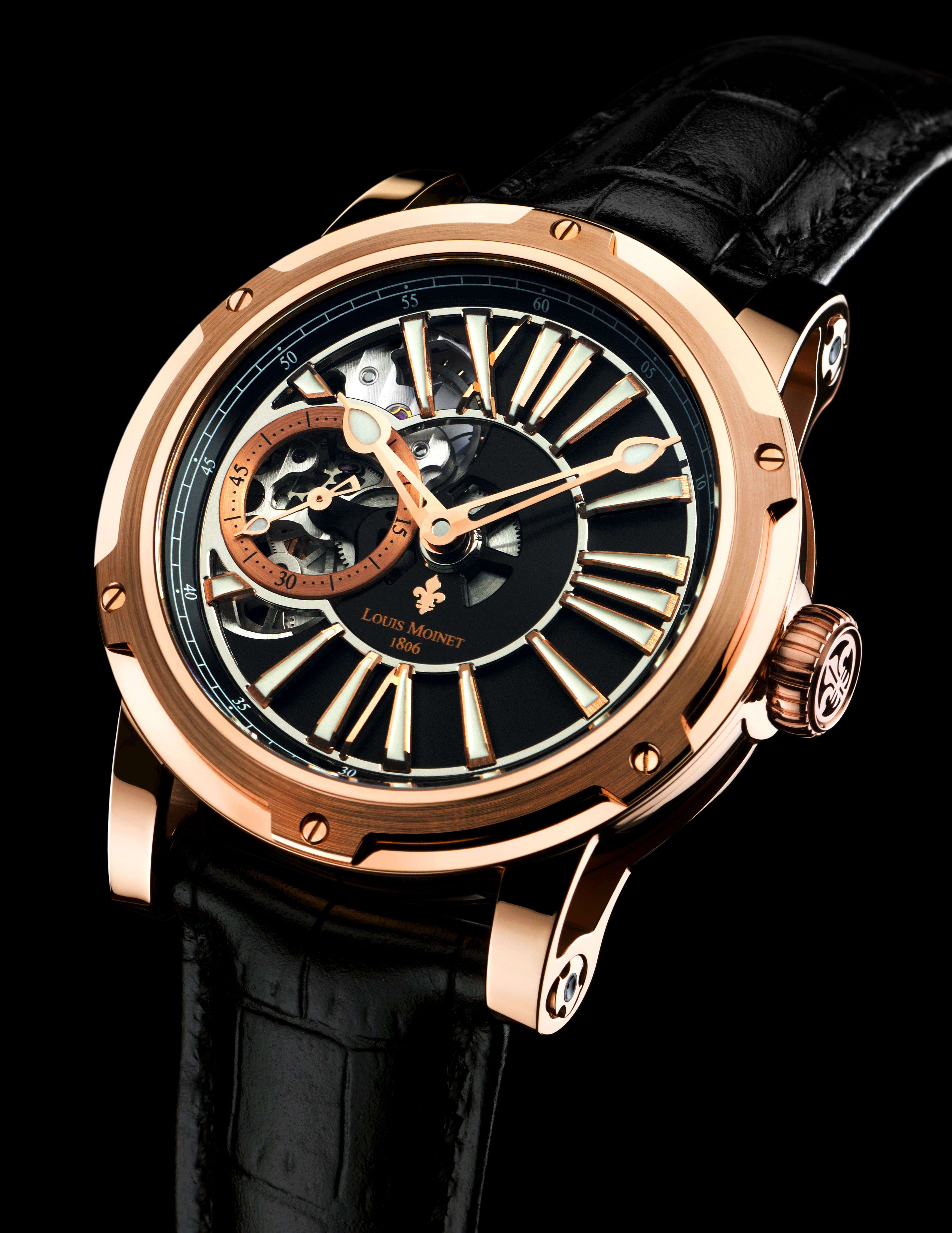 The Metropolis is powered by the new LM45 caliber and features 48 hour power reserve. It embodies Louis Moinet’s distinctive virtues of creative horology, art and design, and exclusivity. The symbols for these virtues are emblazoned on the movement’s bridge. On the dial, between the 8 o’clock and the 12 o’clock, the escapement (beating at a rhythm of 28,800 vibrations per hour) and the offset seconds hand are displayed in all their glory, carefully arranged to ensure an unobstructed view of every detail of the Metropolis’ workings.