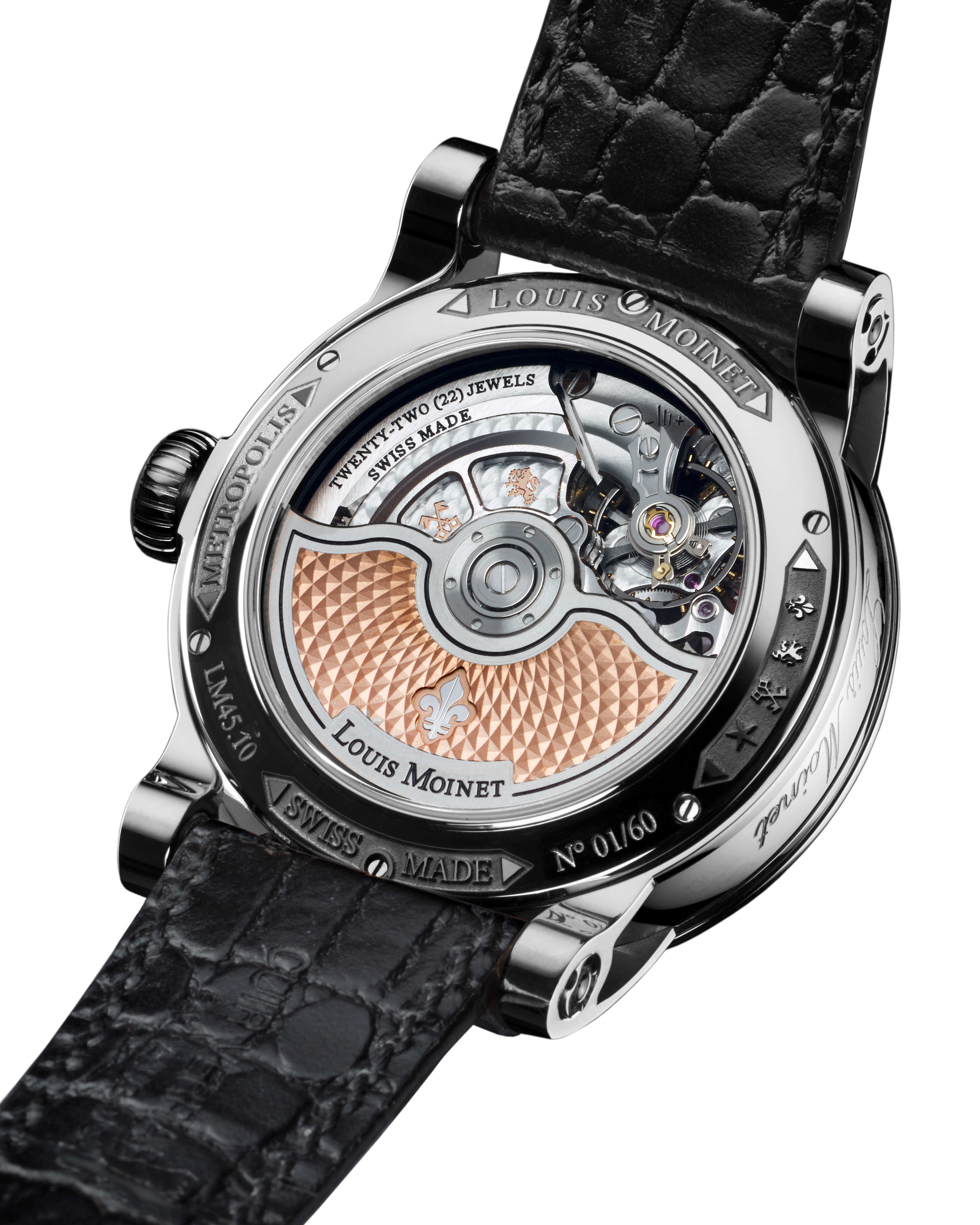The fine finishings of the Louis Moinet Metropolis movement are visible from the transparent sapphire caseback