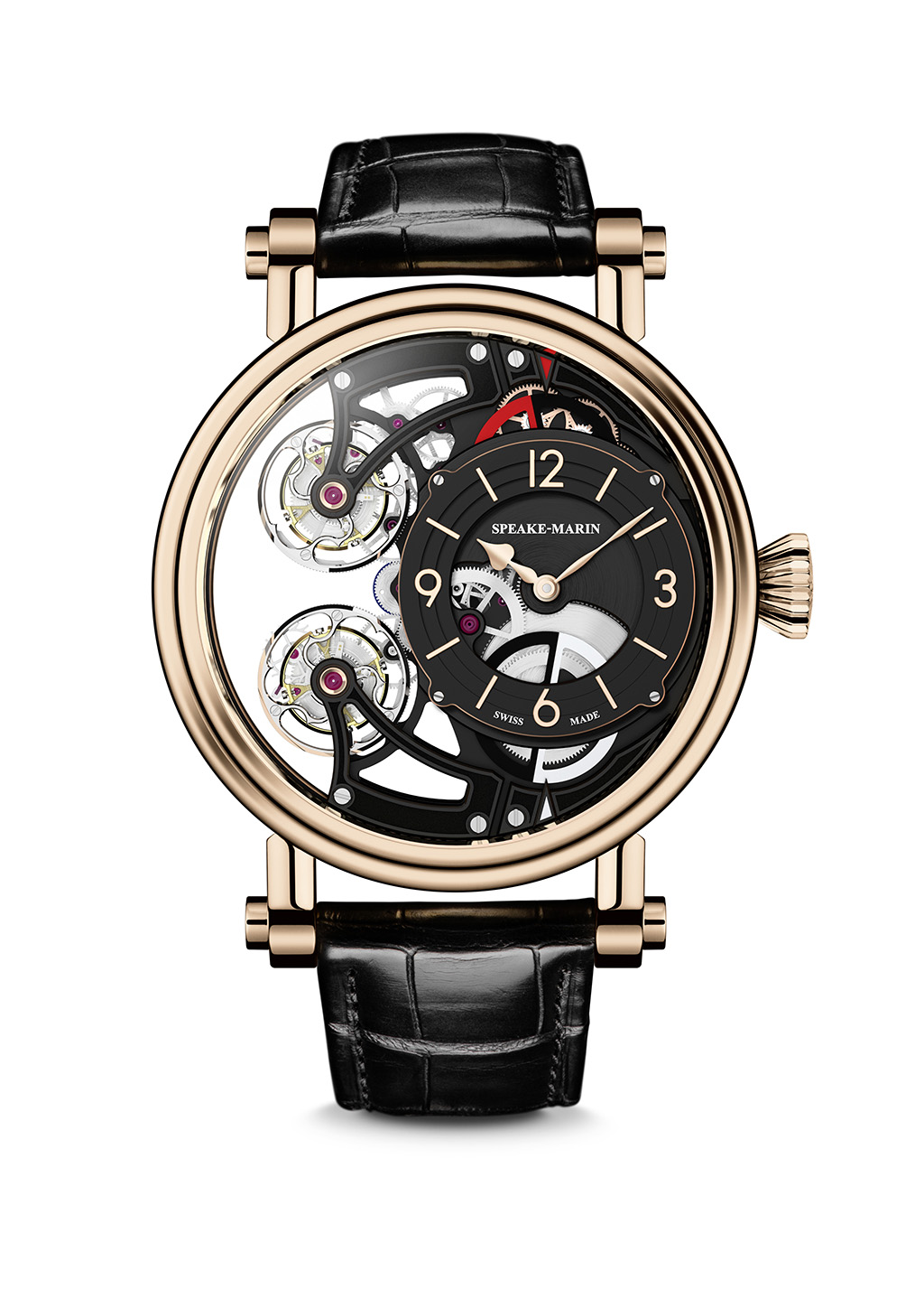 For starters, and as the name would indicate, the Vertical Double Tourbillon Openworked is a highly sophisticated wrist watch. To assemble the piece a master watchmaker needs two weeks to complete the movement. In order to display the open work layout, Speake-Marin needed to reconfigure the original movement. Critical to the redesign was to have the two bridges holding the tourbillons from the plate. A 46mm Piccadilly 18-karat 5N rose gold case houses the Vertical Double Tourbillon Openworked. From a technological standpoint, the functionality of the two tourbillons are aided by a rate stabilizer that was patented by the manufacture. The equalizer links the two wheels by a spiral and helps compensate the speed of the two tourbillons in order to help synchronicity which in turn leads to improved accuracy.