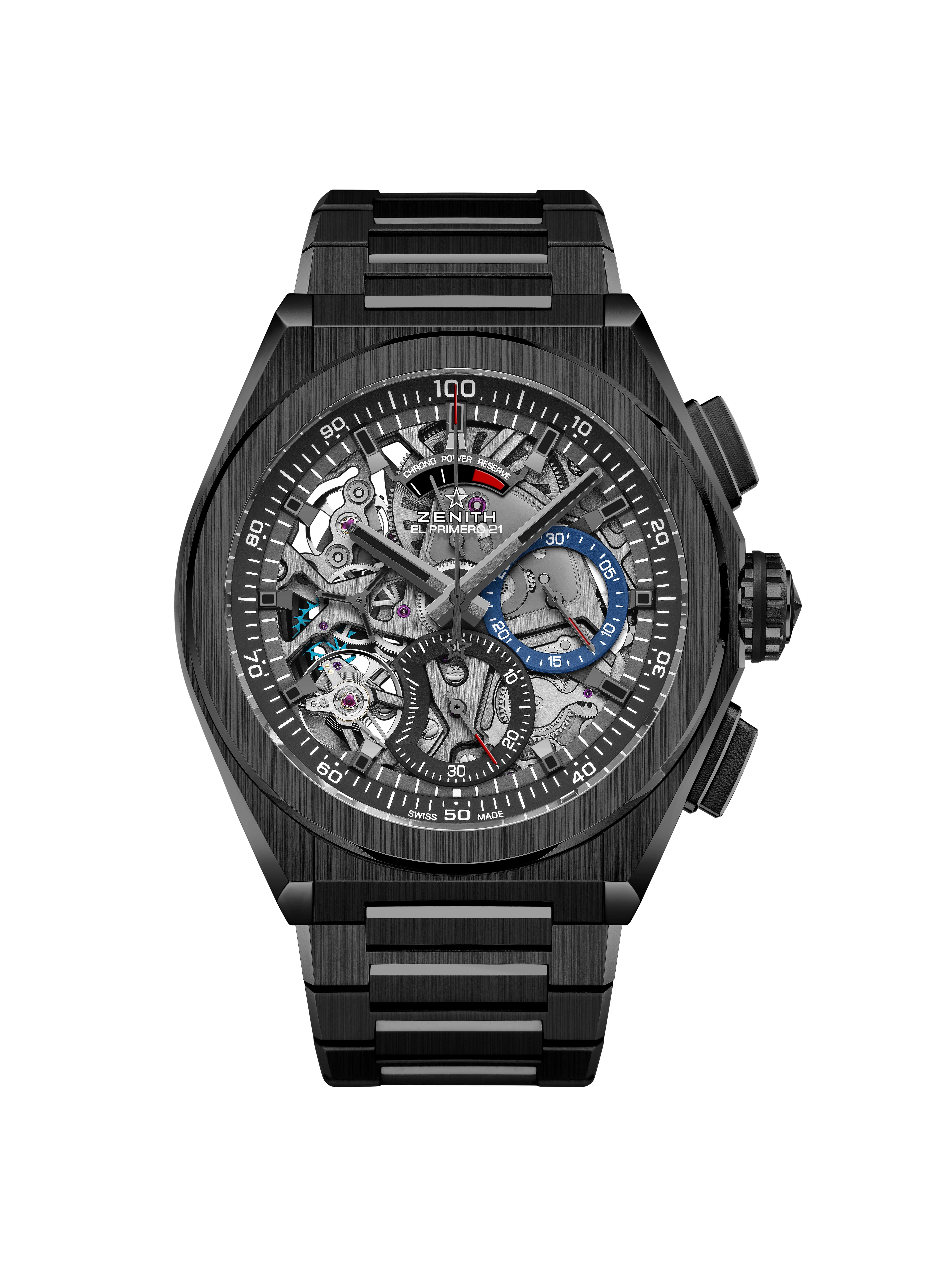 Our other favorite is the Zenith Defy El Primero 21 Black — crafted in a 44mm black ceramic case. A stealth statement, the black version is offered with a sleek black ceramic bracelet ($15,100), or with a black rubber strap ($12,200). This model has a very different look than the blue one, almost a bit more avant grade and mysterious at the same time.