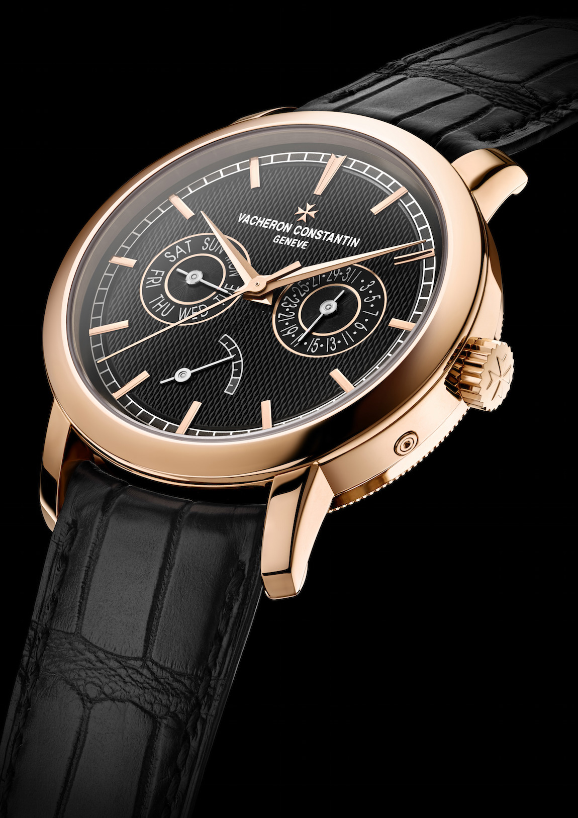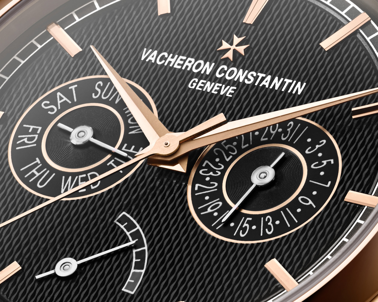Making the watch even more special is the incredible guilloche work on the black dial. The design is created by a single artisas who works with a hand-turned machine to perfectly chisel away tiny pieces of the metal dial to form the pattern. The guilloche dial is accented with 18-karat rose gold hands.