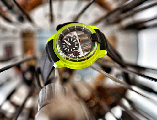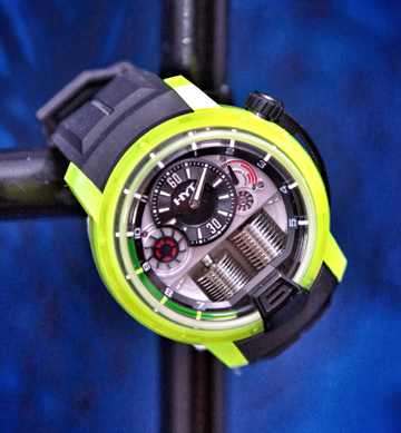 As such, the brand’s newest H1 AZO features an ultra-light resin alloy that the brand’s alchemists developed specially for this watch. It features a tinted fluorescent yellow (the brands’ DNA color) for bold color. The Polyepoxde resin is seven times lighter than stainless steel and four times lighter than titanium. Still, it is 3 times as resistant to abrasion. The watch mechanics remains the same, with its bellows (like car pistons) that filled with liquid that extends into the veins to indicate the time on demand.