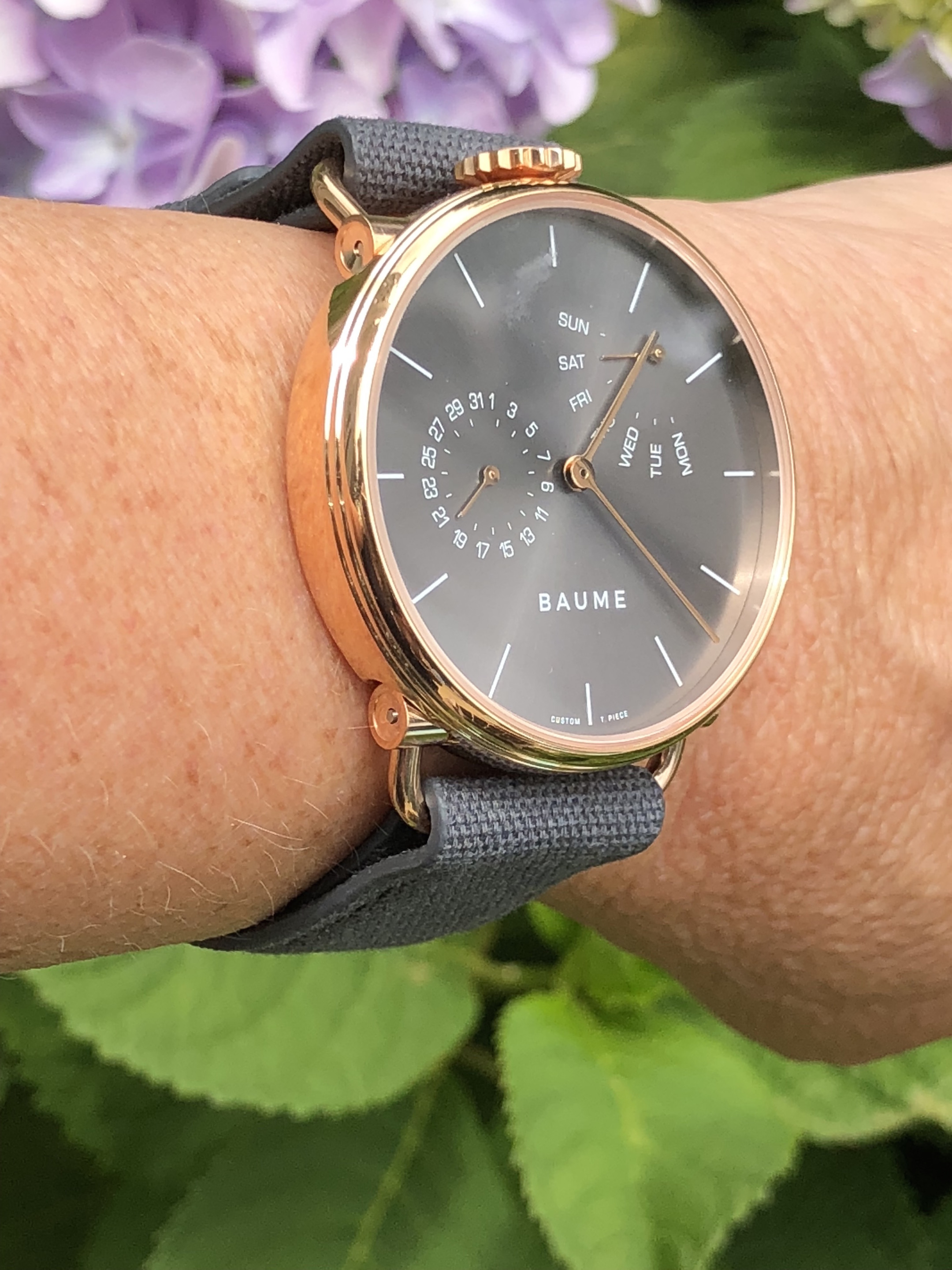 I elected to build my own watch, and scrolled through to find the watch I wanted: a 41mm day/date calendar watch with retrograde day of the week indication. The choices if you start from scratch include the retrograde I built or a small seconds option. (If you opt for an already responsibly made Baume watch, there is the choice of a 35mm a moon phase choice — and that one is a beauty.) With the model selected, I then got to select my dial color and the color of the numerals/markers, as well as the case finish and the strap. All Baume watches are sustainable with case materials that include aluminum, steel and PVD steel. The straps are made from natural materials including cotton, cork and linen. Sadly, when I created my watch, there was no option for a white strap, so I selected gray. Just this past week I learned that the company has added white to the strap color choices. One other very nice feature about ordering my watch was that I was able to further personalize it with an engraving on the case back. The process was quick and easy, and I knew I was getting something I semi-designed.