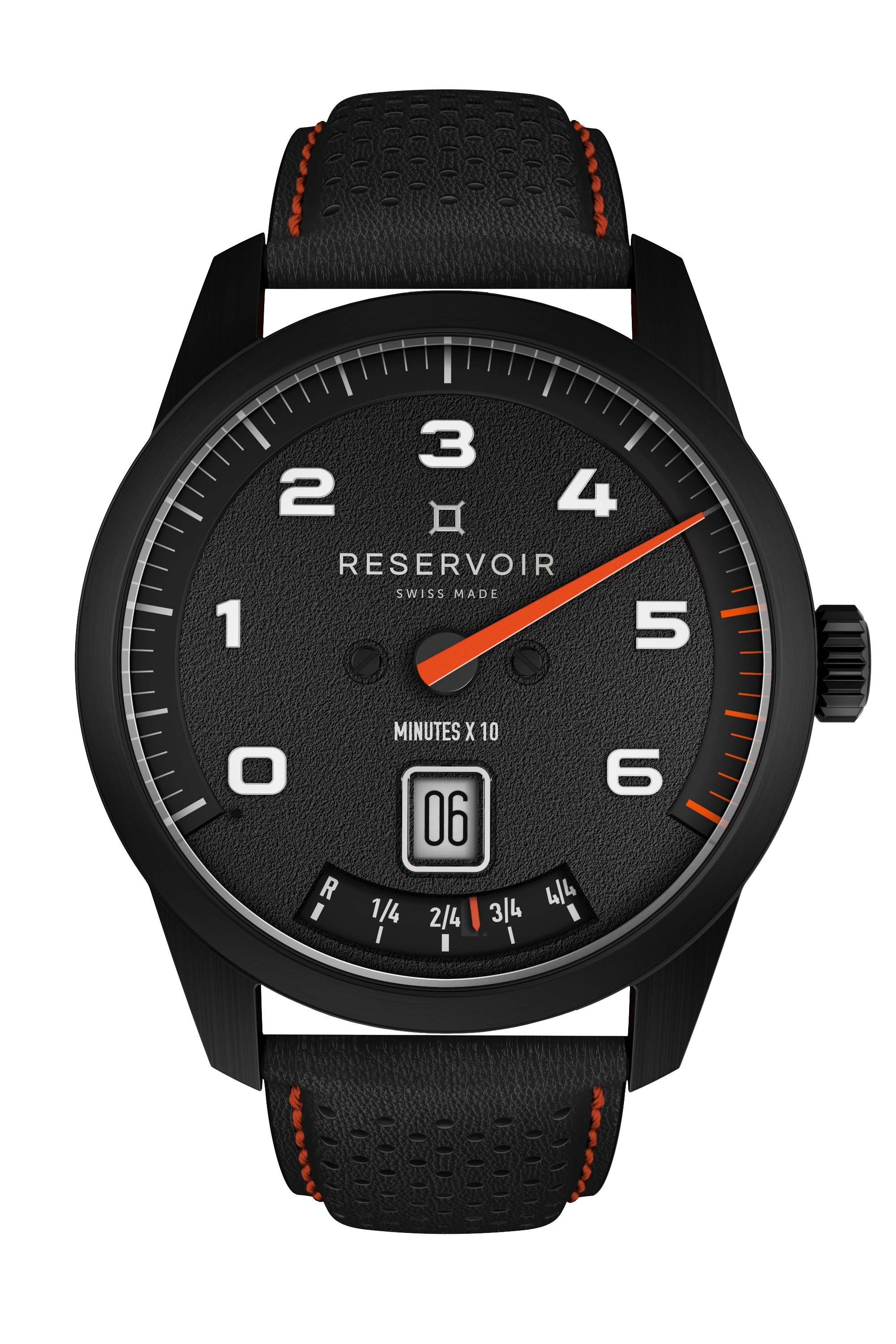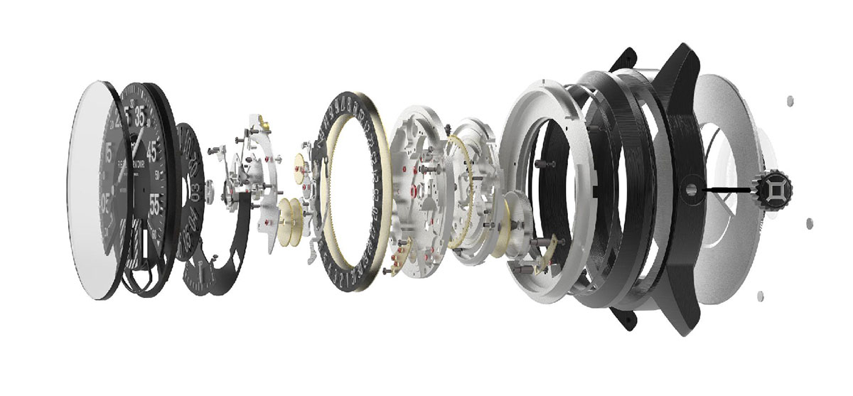 All Reservoir watches house a 97-part proprietary patented module that is powered by the ETA 2824-2 movement, widely acclaimed for its reliability and precision, oscillating at 28800/h. Every watch also offers 34 hours of power reserve. The 240-degree retrograde minute indication recalls rev counters, manometers and the altimeters, while the jumping hour is reminiscent of kilometer counters, and the power reserve display echoes the fuel and oil gauges.